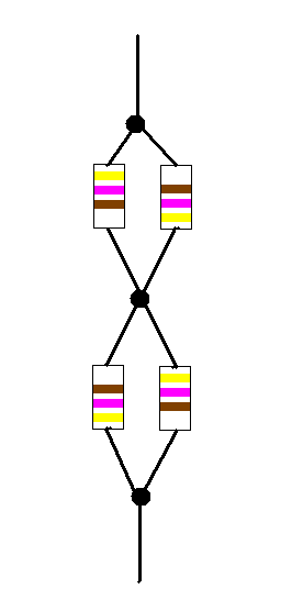 Here is the way to make 4 resistors of the same value equal the same value, but handel 4 times more power. This is four 1/4 watt, 470 ohm resistors to make one 1 watt, 470 ohm resistor.