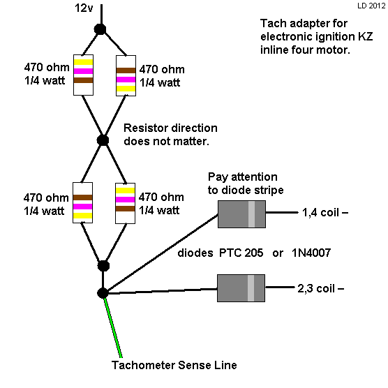 A "pull-up" provides a source of voltage. The ignition produces the "pull-down" signal on each coil, which pulls down the voltage that the tach wire is sensing. The diodes isolate the 2 pull-down signals from each other, so one ignition circuit won't pull down the other. So the tach signal gets a 12v signal that gets pulled down each time any coil fires. This creates a pulse chain of high and low voltage. That's what the tach uses to sense the RPM.