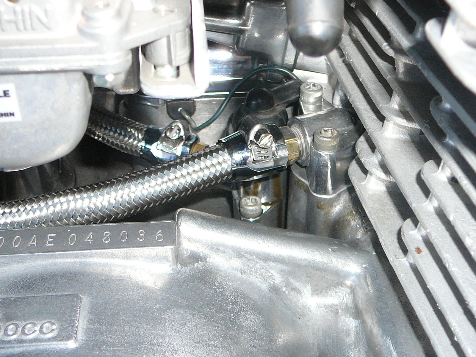 The return line from the other end of the cooler will go to the upper case fitting behind the cylinder (right side of rear engine, oil pressure screw tube)thus feeding oil back into the system being passed up into/through the rear cylinder studs up to the head.