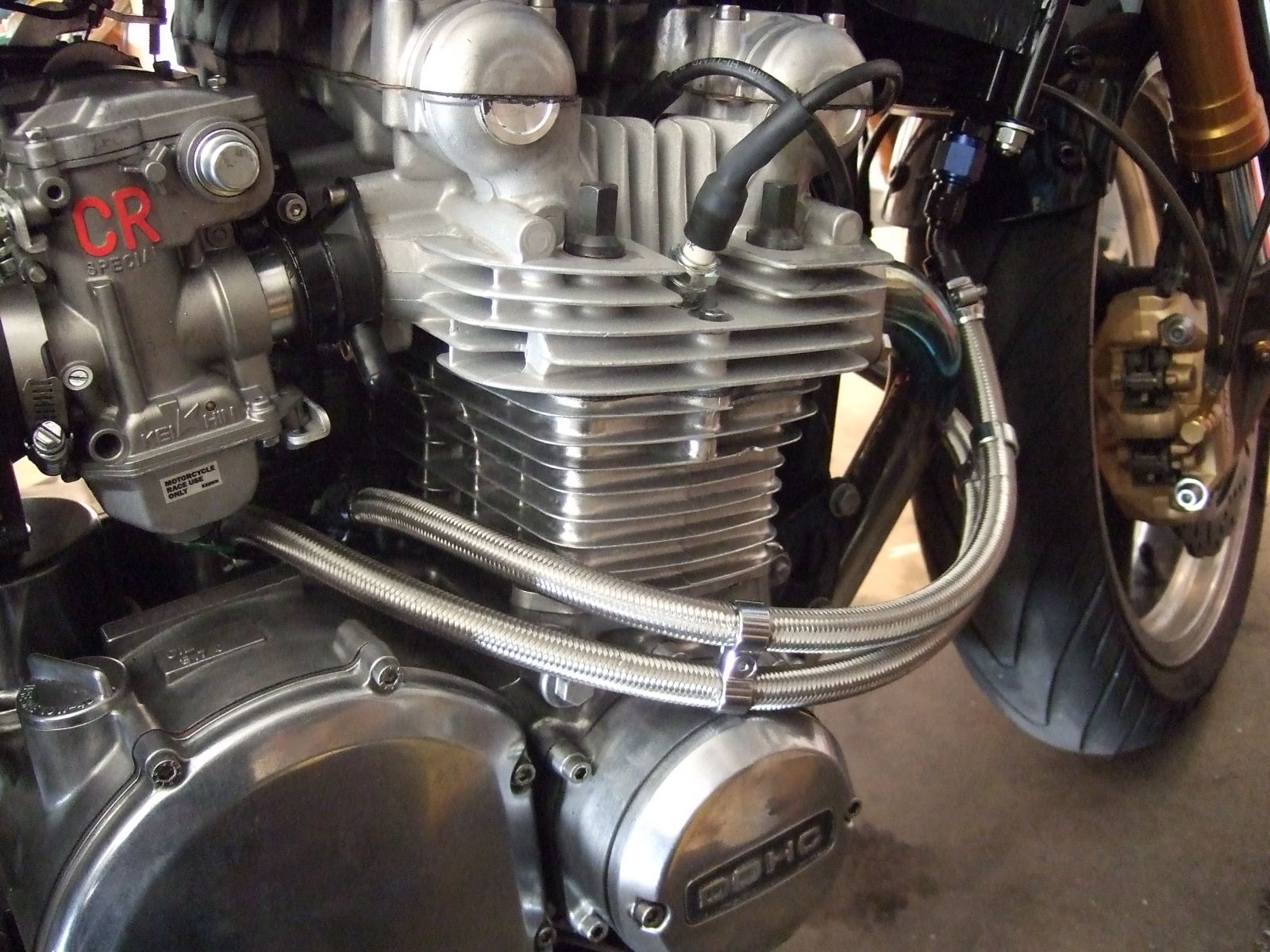 The return line from the other end of the cooler will go to the upper case fitting behind the cylinder (right side of rear engine, oil pressure screw tube)thus feeding oil back into the system being passed up into/through the rear cylinder studs up to the head.