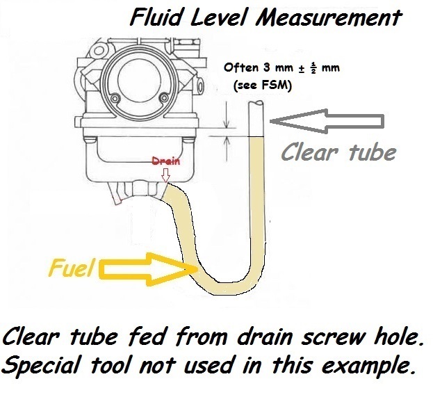 Carb must remain in a stable level position during the test, such as motorcycle on centerstand or otherwise held steady in a balanced level position. Or carbs may be held level on the workbench.