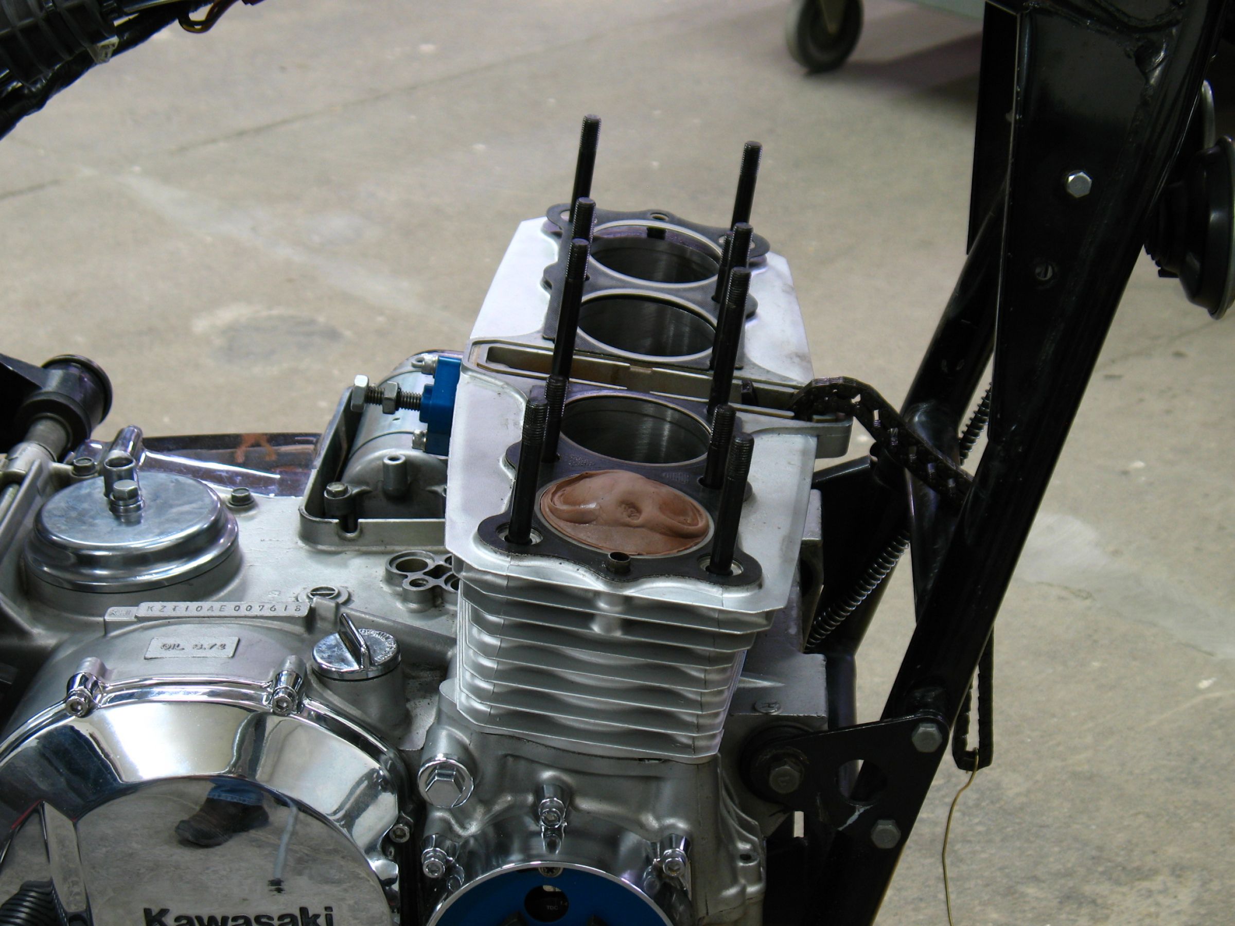 I believe (soon to be proven right or wrong) that a J head can be used with late GPz style pistons with no change in engine compression ratio (CR). Spark timing might be adjusted for the different combustion chamber shape. I am currently assembling a 1395 cm3 big – block engine I’m building this year for myself. I am using a twin plug / ported / big valve J head (thanks go to Larry Cavanaugh) with late (83-84) GPz style pistons. Even though the pistons are sold as 10.5:1 compression ratio, my measurements and calculations give an actual 12.3:1 CR, which is helpful with high lift / long duration cams – bonus! A buddy is building an otherwise identical engine but using a late GPz head with single spark plug. I’ll keep everyone posted on which bike goes faster down the ¼ mile later this summer!