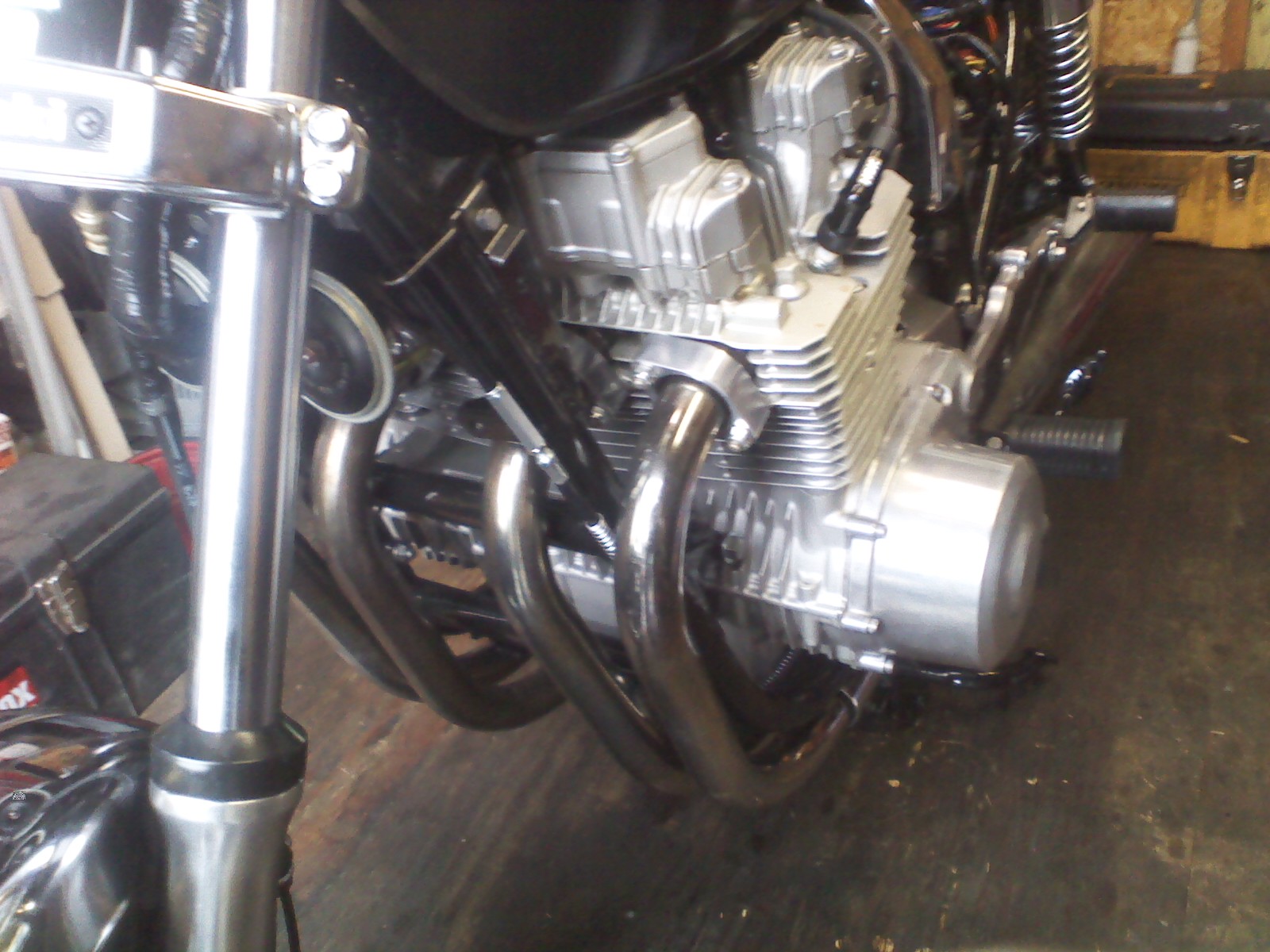 I removed the stock exhaust yesterday. I stuffed shop towels into the exhaust ports, sprayed on cheapo degreaser, then pressure washed the oil and crap off of the front of the engine and center stand. I let it dry in the shed last night with a fan blowing on it, since I couldn't give it the usual interstate 70 dry cycle.