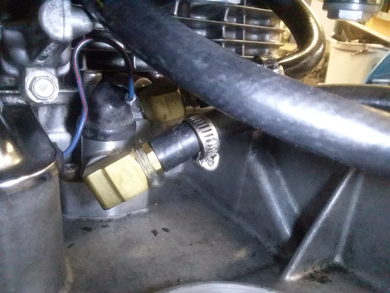 Finally I removed the cooler adapter that returns oil to the main gallery. Perfectly clean and no obstructions. I tried to get the pressure switch send adapter off without removing carbs but couldn't get it. And I know oil went way past here anyway and now that I think back, I went all through these parts about a year ago before I installed the carbs.