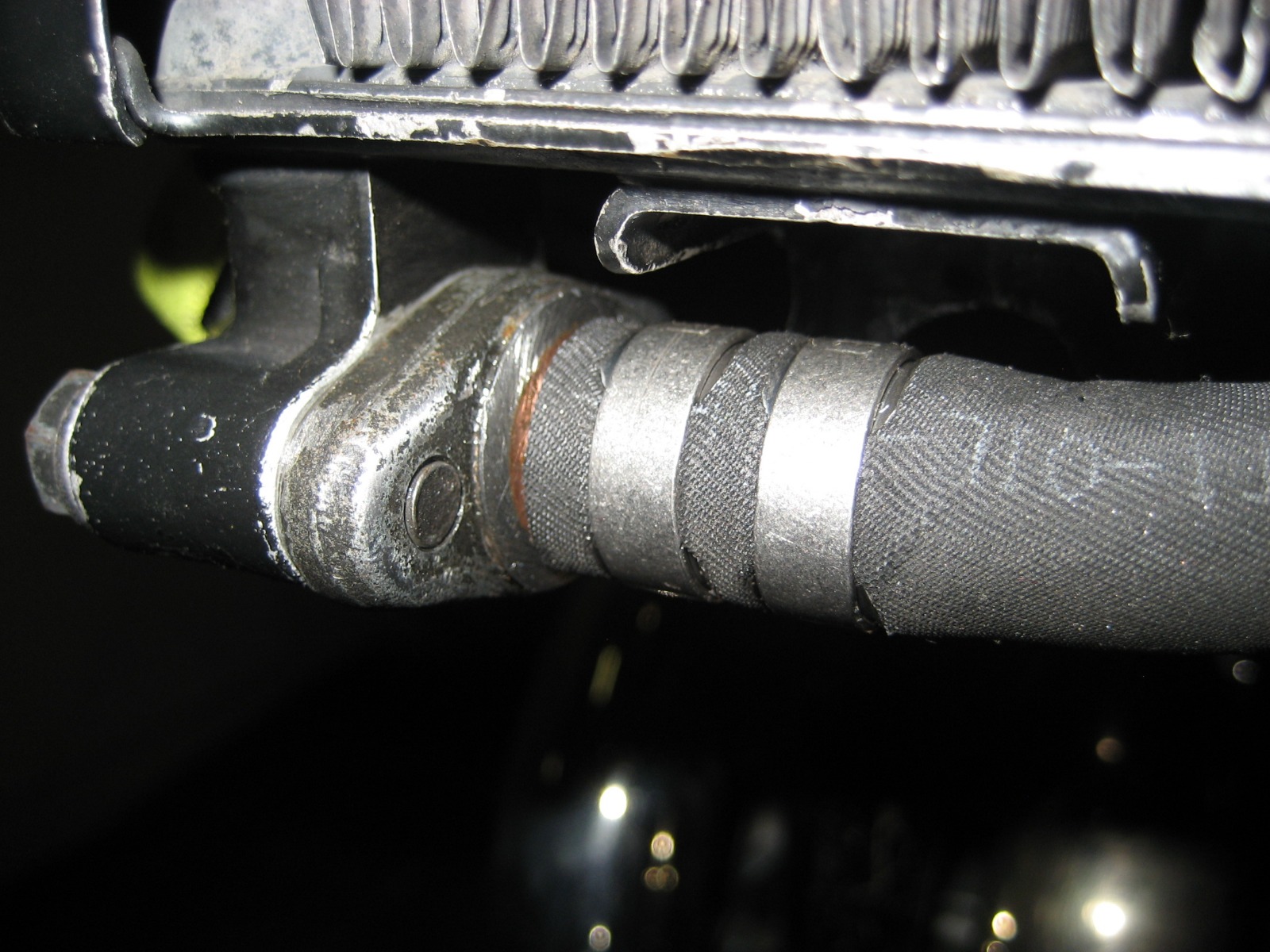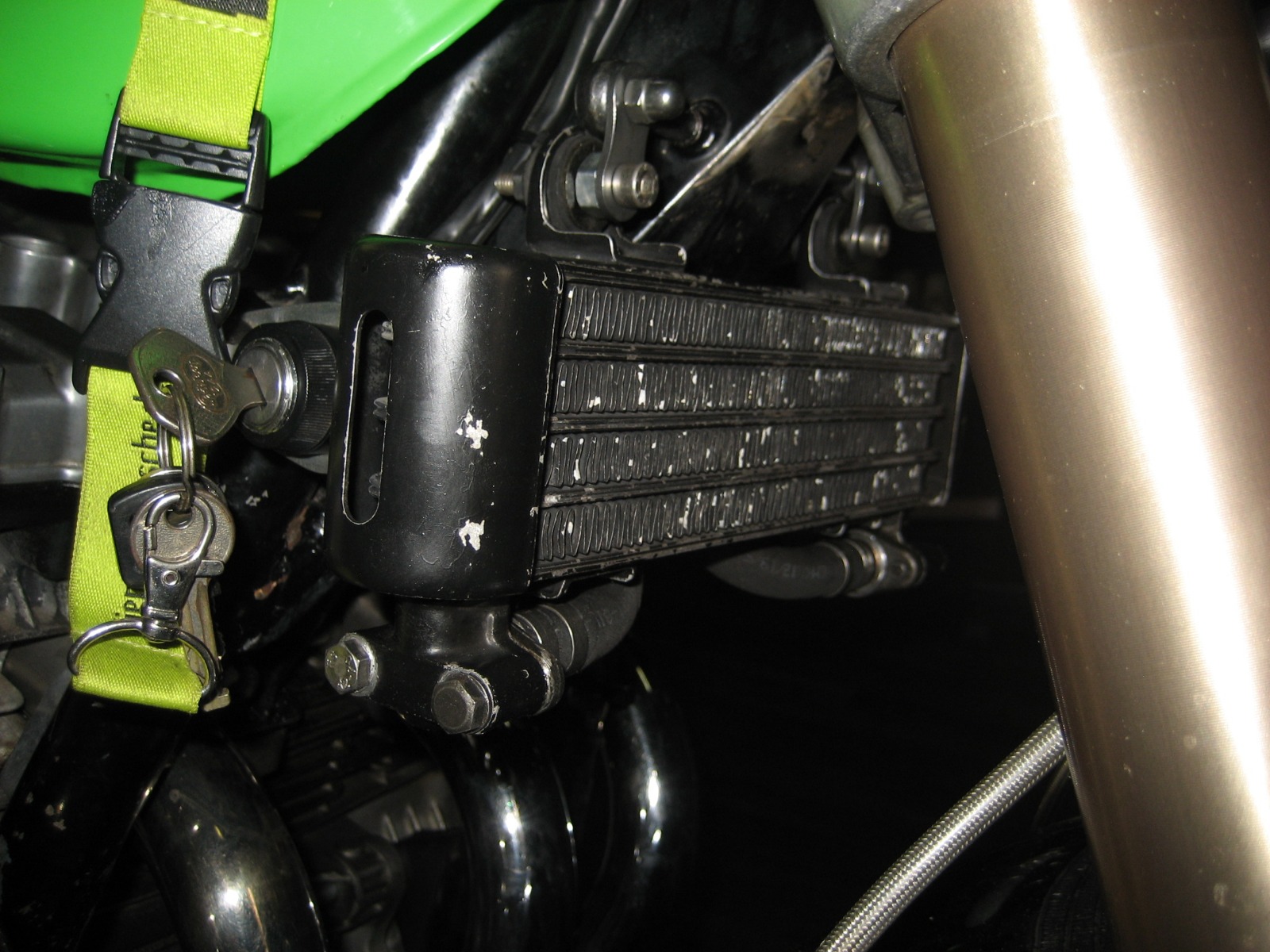 Nope!!!! The top parts of my oil cooler mount are NOT Z1 battery hold down straps. I started with 1 inch x .080 4130 moly. Heated and bent into shape. The hard part was getting the 180 degree bend where the rubber straps fit into to match. It took me 4 or 5 different pieces to get 2 matching straps. I used to hang around a welder that built Pro Stock drag race car chassis' That is where I picked up all my metal fabrication skills from. He even made the comment one time that he should charge me for all the tips and information I picked up just from watching him work with metal!!!