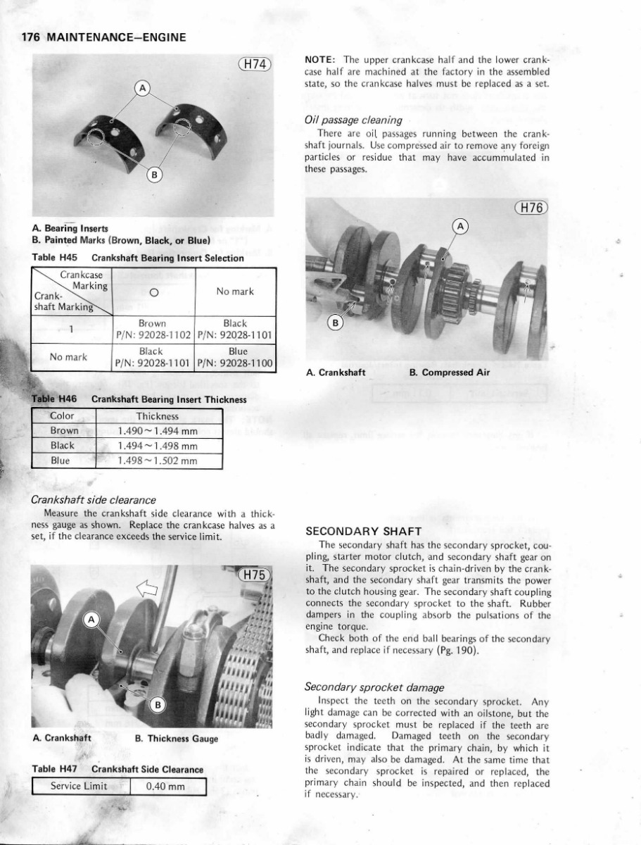 Can anyone help me with the color codes on the crankshaft bearings for a 1982 Kawasaki GPZ 750? I am ready to install the crank & am missing a bearing (been torn down for months). I now want to replace all the crank (main) bearings (10) of them. Need to use stock size & I know the have stock & oversize. Color codes identify the size of the bearing & I can't seem to find the info to place an order, so I turned to my buddies in this forum.