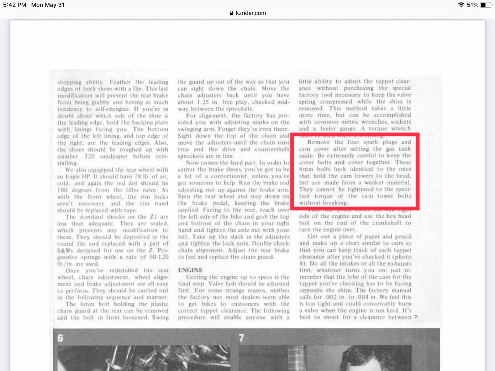 31 May 2021 15:56Because of the discussion with Robb2018 and his cam chain issues, reminded me I recently read an article in the file base. It’s a write up on getting top performance out of the Kz900. In the article it says to make sure you keep the cam cover bolts separate from the cam cap bolts. It mentions that although they are similar in looks the cover bolts are made of weaker material. I have heard of several guys snapping cam cap bolts within the torque spec. As anyone heard this and how would one confirm it. Also how would you separate them out of a pile. Here is the paragraph in the article.and a screen shot of the article title. Just thinking this could save us all headaches.
