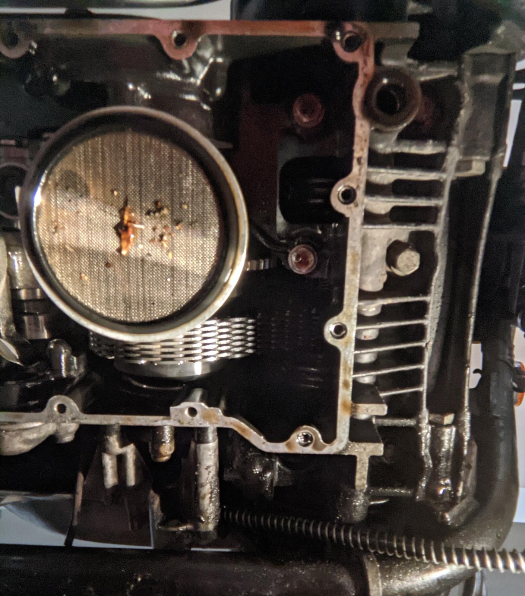 I took a look at the oil pump screen, and it was definitely dirty, but I don’t know if I’d go so far as to say it was clogged… there are some small particles, and that large object is a piece of a leaf. The streak across the middle is just due to the lighting. Does this look like enough debris to be causing the drop in pressure?