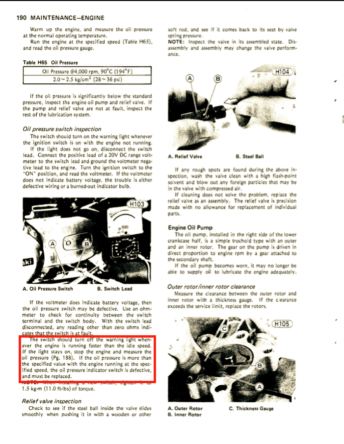 07 Nov 2021 16:10I've read that section as well, which is why I wasn't too worried at first. Initially the light was shutting off around 1300-1500rpm, but more recently it had been staying on up until 2000rpm. Also, my pressure tests indicated about 20psi at 4k rpm, which is lower than the ideal range listed on that same page of the FSM (28 - 36psi).