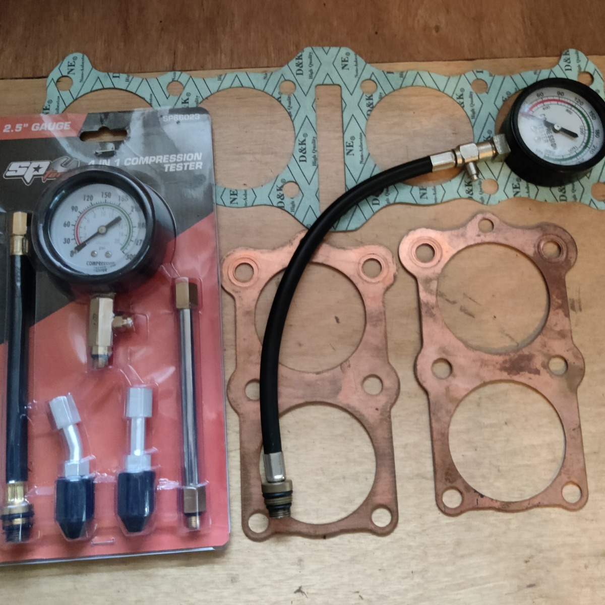 I've included a picture of the 2 compression gauges which I used and base gasket and the new copper head gaskets which I'm going to useI remove the barrels the checked rings pistons and bores all good