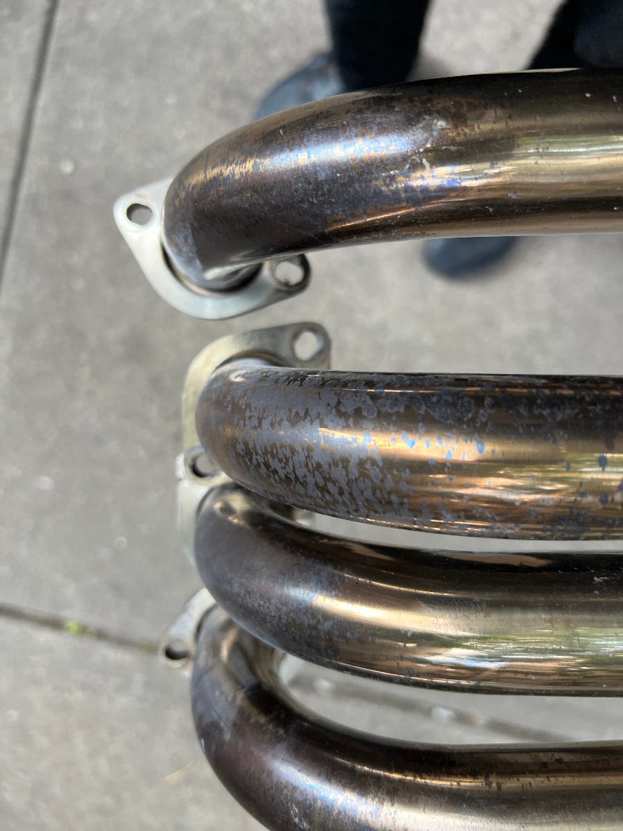 I was ready to throw them out!. This is it on the bike, I have since put another on it. You will need the muffler part. The pipes have no rust on them. Anything you see is dirt/oil. If you put toilet bowl cleaner on them, it will remove all gold color and make them look brand new. Keep in mind, everyone who is watching, that toilet bowl cleaner contains a chemical that wil will turn gold or blue pipes back to their original color. You spray it on for no longer than a minute, then brush/wash it off.