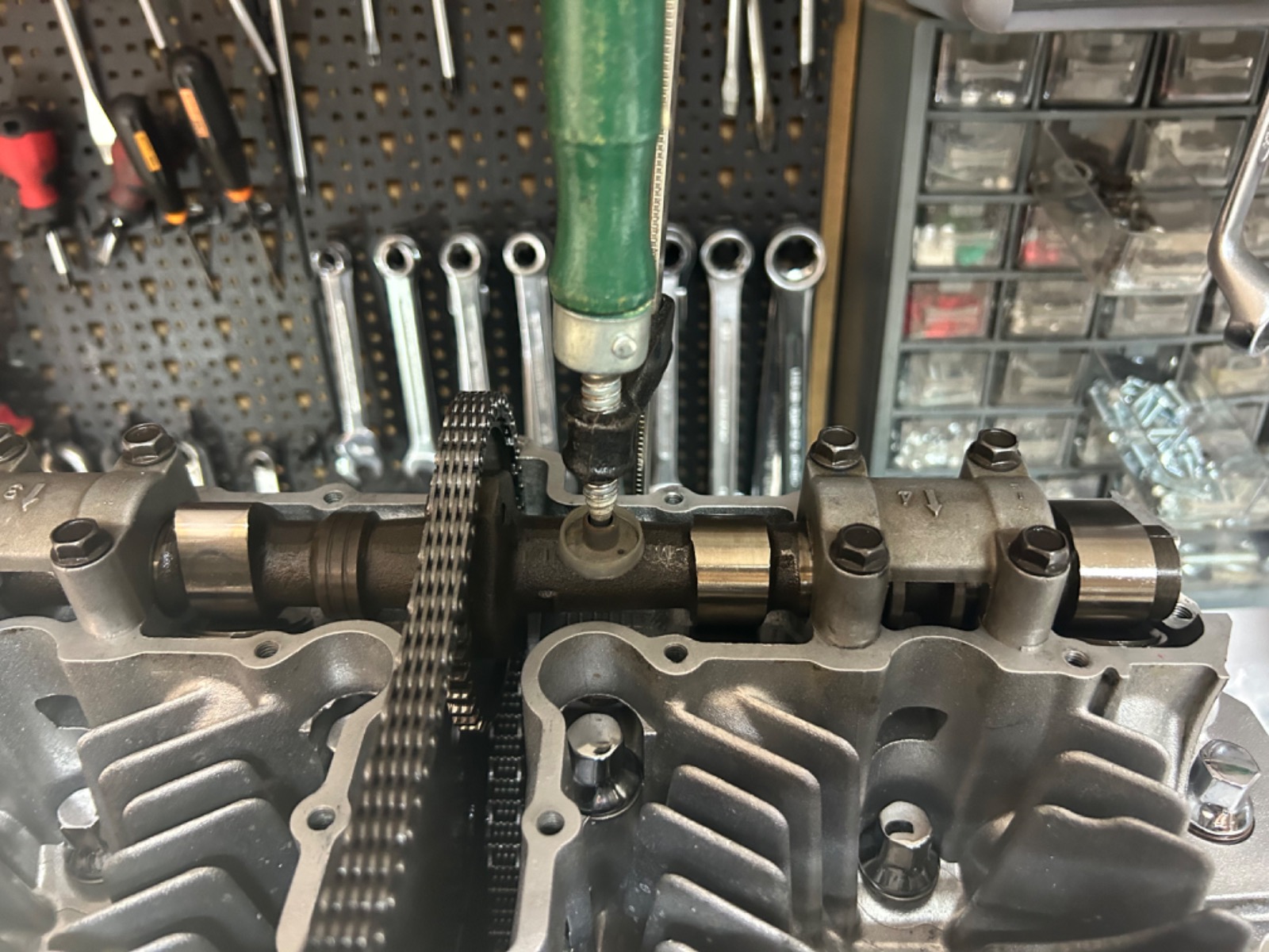 So… following all the advice; camshafts want in really well, being held down with a clamp. I did it differently this time, and I got the camshaft caps for the exhaust side in place before putting the intake camshaft in place.