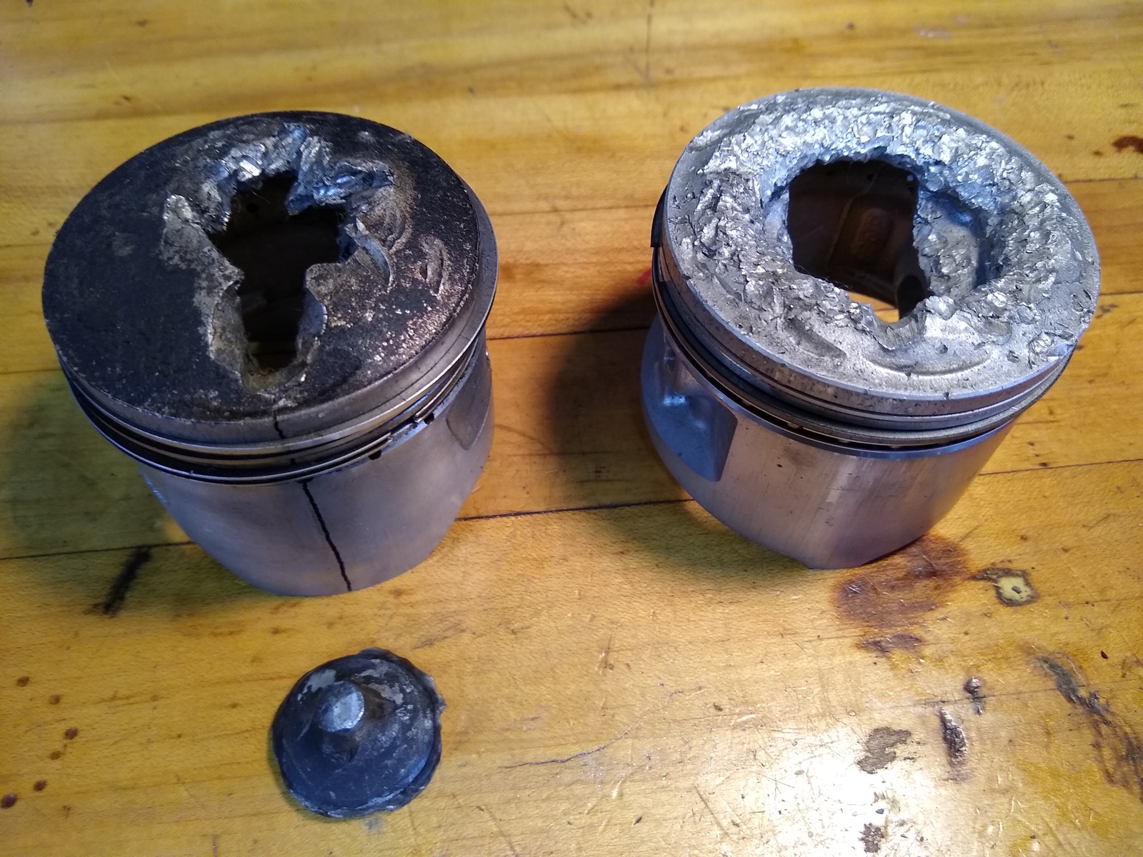 10 Jan 2023 09:13 - 10 Jan 2023 09:15Totally agree with zed1015 on the detonation/preignition diagnosis. And, here's a pic illustrating mechanical damage (vs heat damage) to piston crowns caused by a broken valve head, in both cases, bouncing around the combustion chamber. A KZ900 piston on the left and a KZ1000 on the right. Gruesome stuff. Not from any of my motors, fortunately. In both cases, these came from stock motors that were dragraced, as is, without any prior prep (such as fresh valve springs ). Take a shortcut and you do so at your own peril.and no other witness marks evident on the crown, bore or head which would have been unavoidably made by a foreign object it was certainly solely the result of detonation/overheating caused by a very weak mixture .