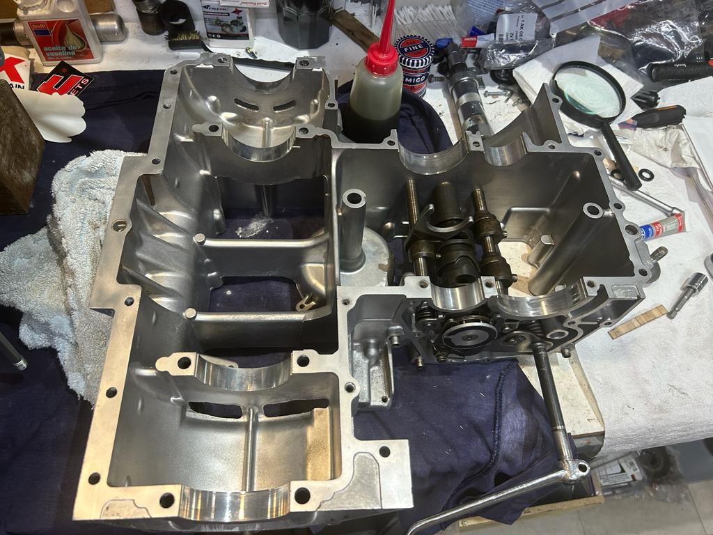 - Assembly has begun. Crankshaft in place, new cam chain in place (original was a bit stretched)... all in a superclean engine. Happy!