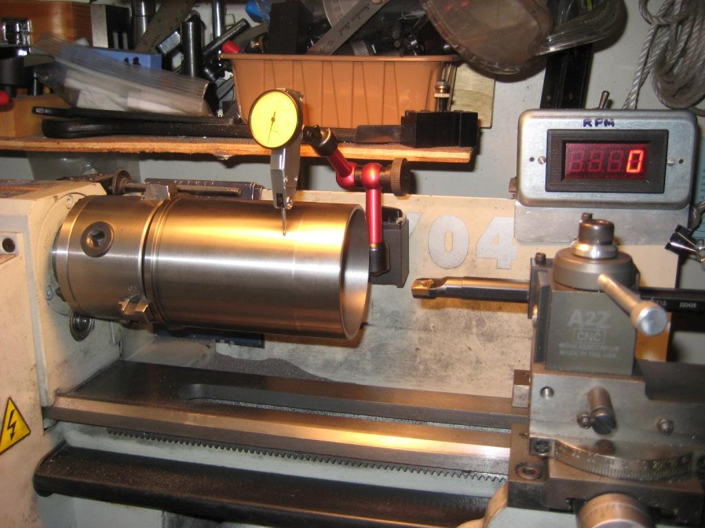 At home all I have is this 7x12" mini lathe for fabricating small parts. I found out my 3" chuck could hold the sleeves I just needed a longer stiffer boring bar. I figured I could do half way in then turn them around to do the other side.