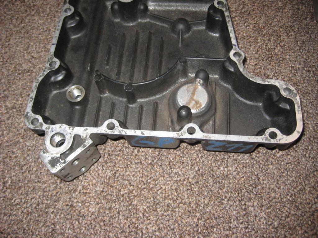 The plug the separates the inlet/outlet flow on the GPZ pan is M14, I did not want to buy that tap or find those plugs. I did however have a 9/16-18 tap which is the size for -6AN.I had one -6 flanged plug that I cut the flange off on my lathe and a cut off -6 thread from a bulkhead fitting. The cut off thread needed a plug for the middle, pressed one in then cut a slot with a hacksaw.
