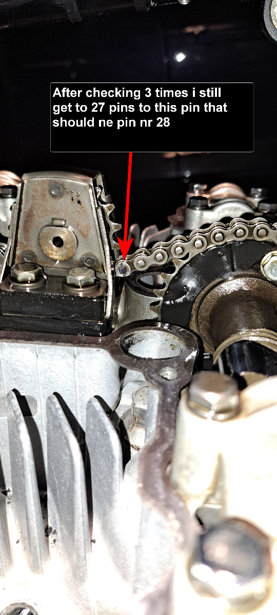 I need confirmation that the timing is not right set.I rotated engine to TDC 1 and 4 then the little arrow on the exhaustcam sprocket is just a little over the head surface not flush..So then i counted the pins on camchain.I started with the first pin above the little arrow mark on exhaustcamsprocket .I marked the pin that is in line with the 28 mark on inntakecamsprocket.Tested 3 times and it is only 27 pins to the 28 mark. Can you confirm i did this check right? What will be the easyest way to move the chain take off the sprocket while i try to not make it jump on the crank sprocket? or will i get enouh slack in chain if take the cam chain tensioner out?
