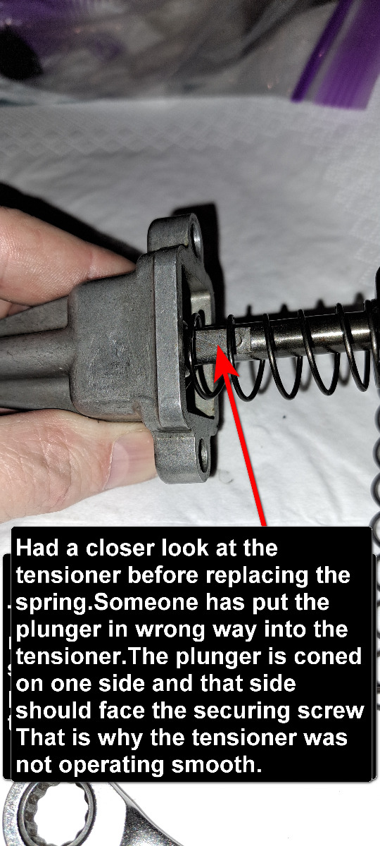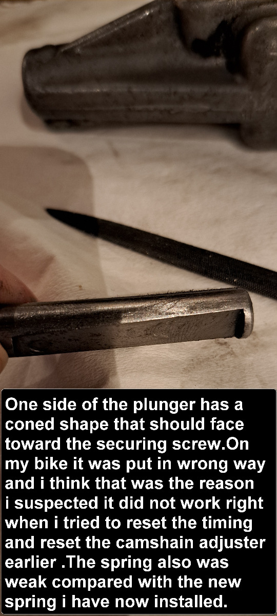 .Maybe not so interesting ,but think i found out why the camchain tensioner acting like it did not work right earlier when tried to set the timing. The problem then was that the chain was too lose.The coned plunger was placed wrong way inside the tensioner .That made it stick