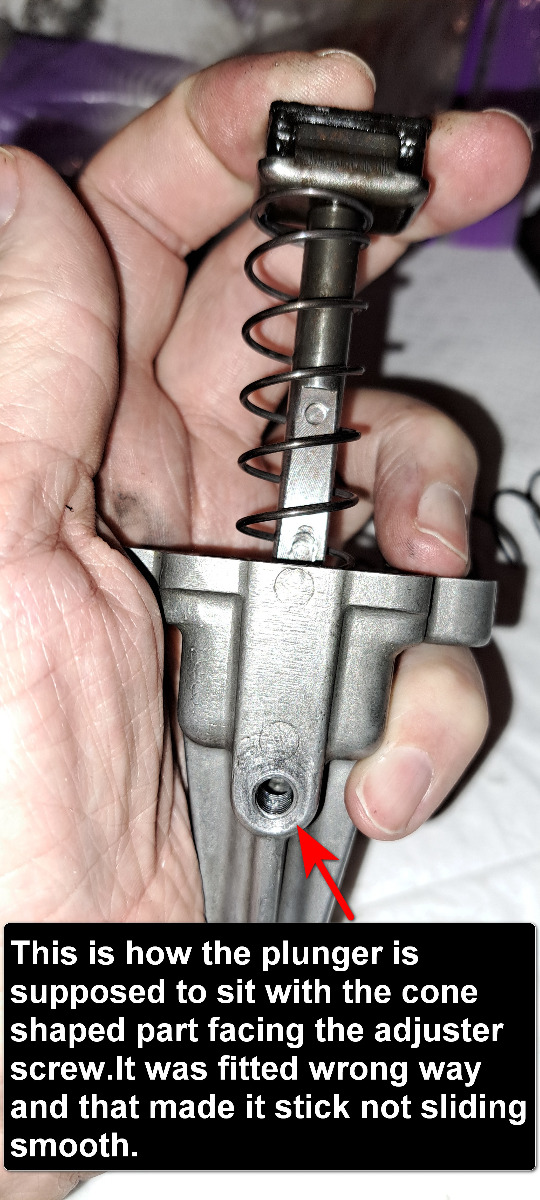 so it did not release right.I remember that when i installed it the way it is supposed to by first push plunger in and then lock the adjusterscrew and install the hole unit.When i then released the adjuster screw it did not make any click noise also no noise when turning the engine on crank. The spring was also weak and had been shorter so have now fitted a new spring.