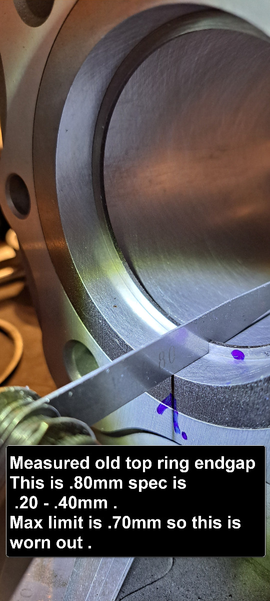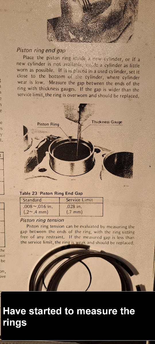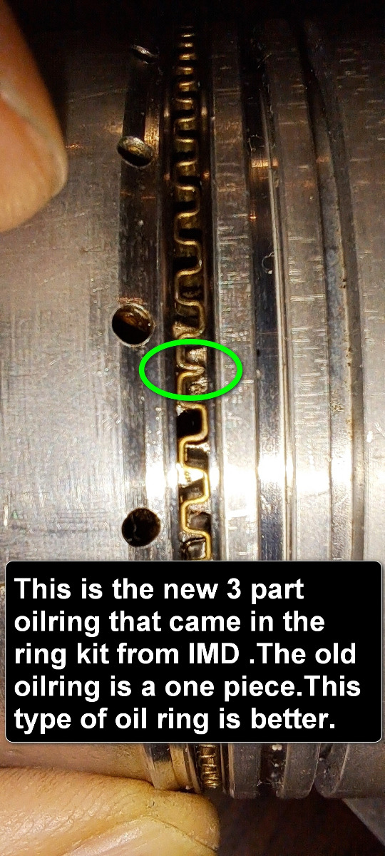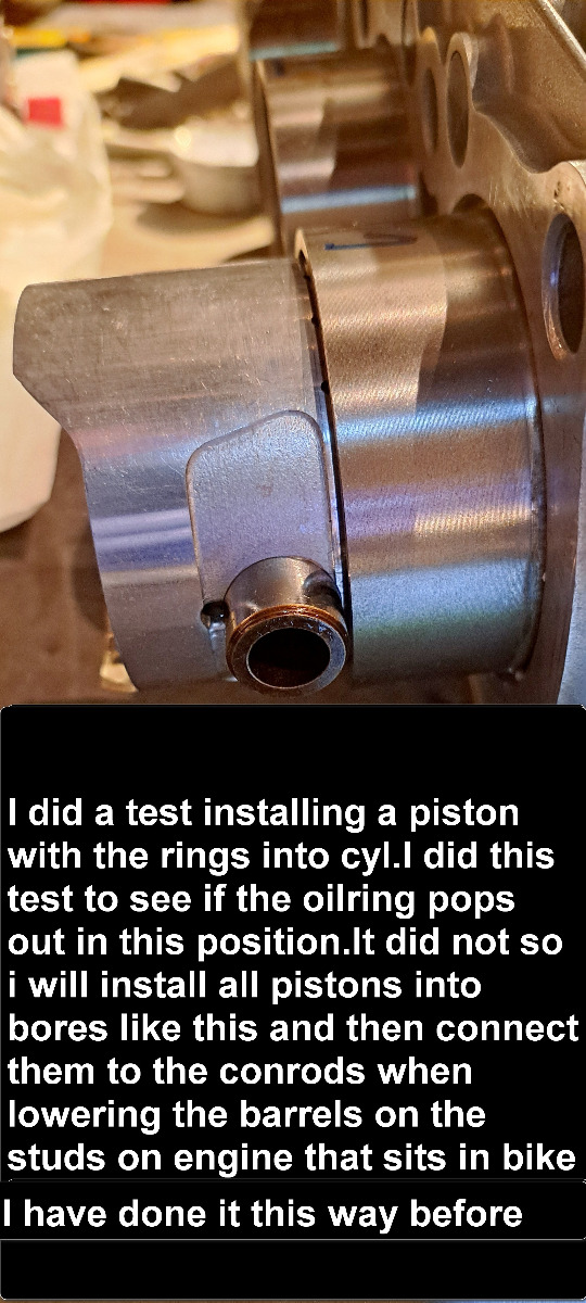 Have started to measure the new piston rings that i bought from IMD pistons.The oilring is different it is a 3 piece ring .The old oilring is a one piece type.I did a test to se if the oilring popped out from under the bore.It did not so then i will install all pistons into bores first with a piston ring compressor and connect them on the conrods when engine is sitting in bike.I have done it this way before and think it is a little safer for the rings and easyer.