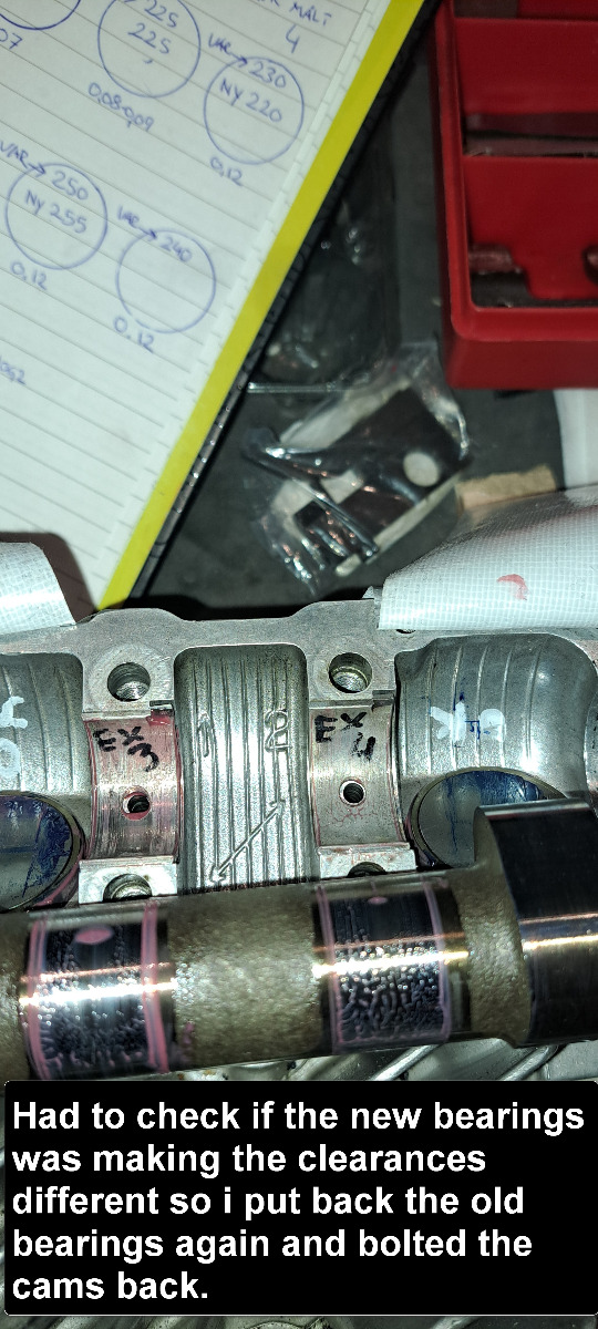 Thanks for many advices. Well i now did a new check by take out the new bearings and put in the old bearings again and bolted the camshaft on. The clearances was the same with old and new bearings so that was good!. I think that the measurements i did back in september / oktober was not so acurate because then i did not bolt on the cam caps