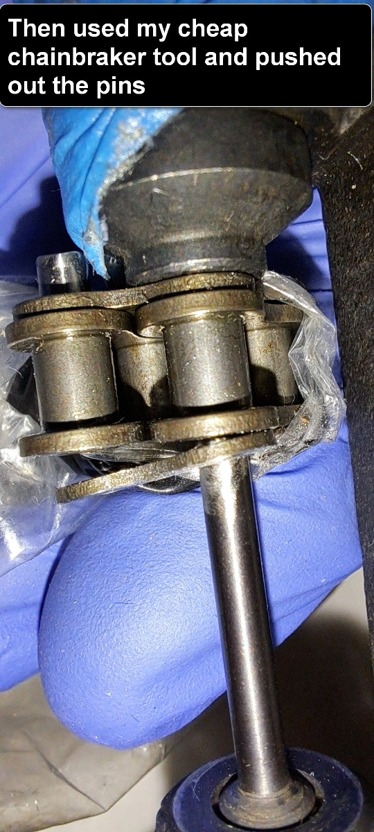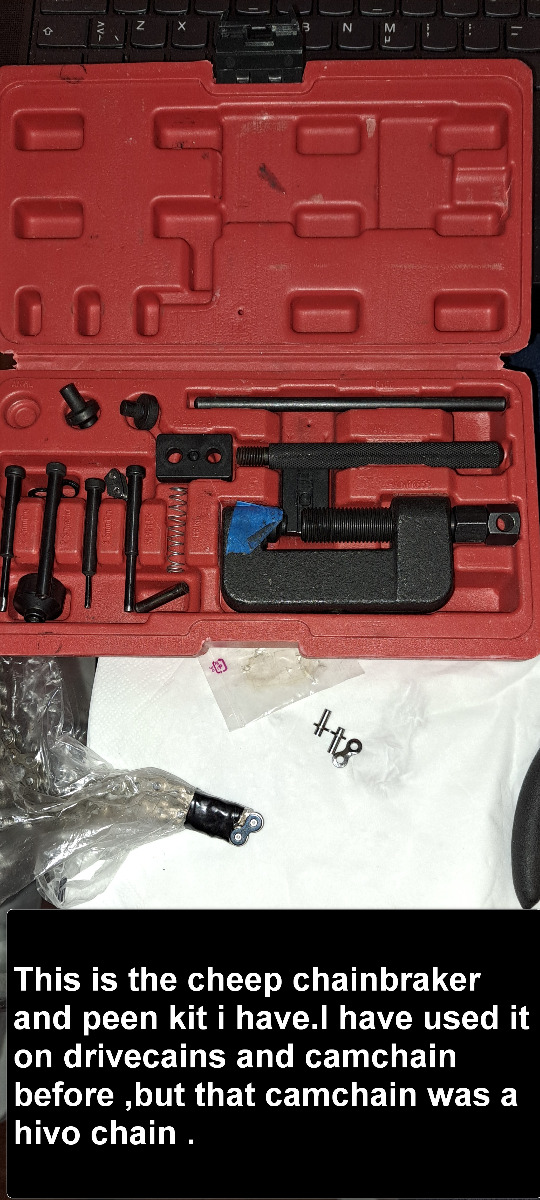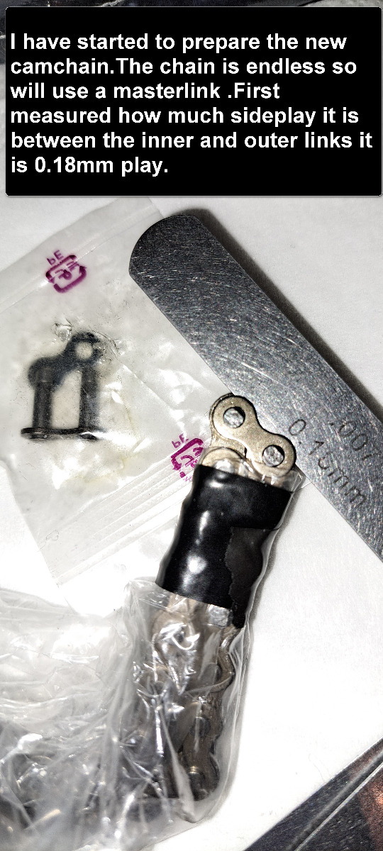 I started to prepare the new camchain that i bought from z power uk.It is endless and i think it was included in the camchainrollersprocket and sliders kit if i remember right.I bought a masterlink because will have to split the chain.I use a cheap chainbreaker kit bought from ebay some years ago.