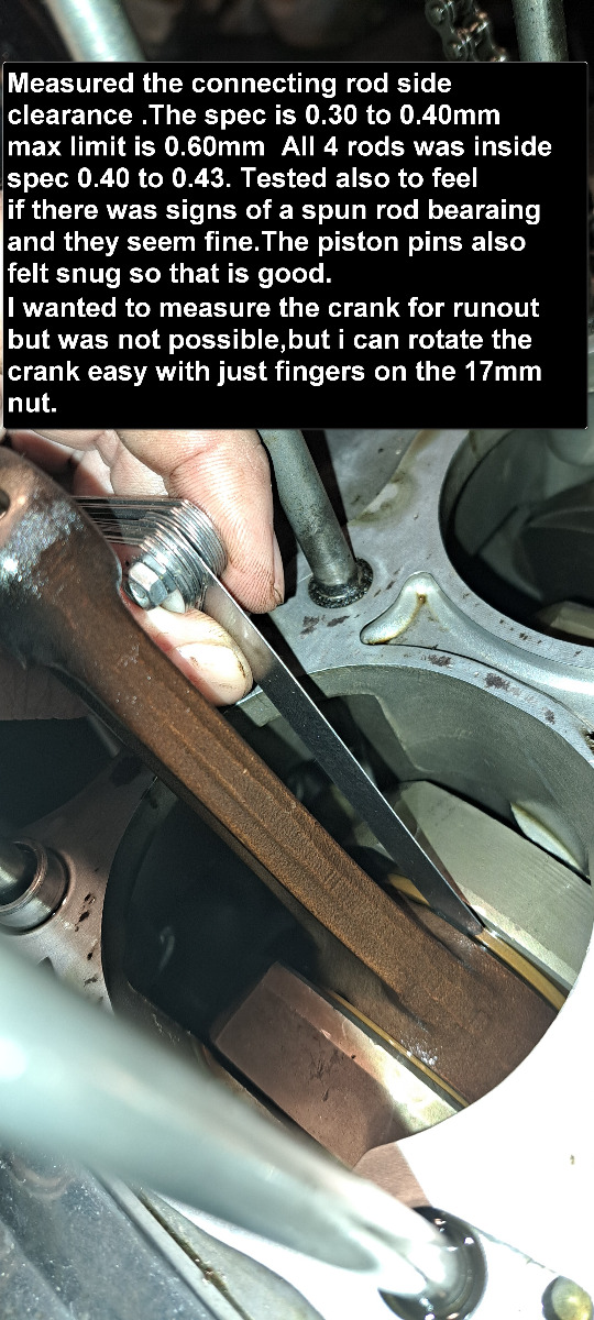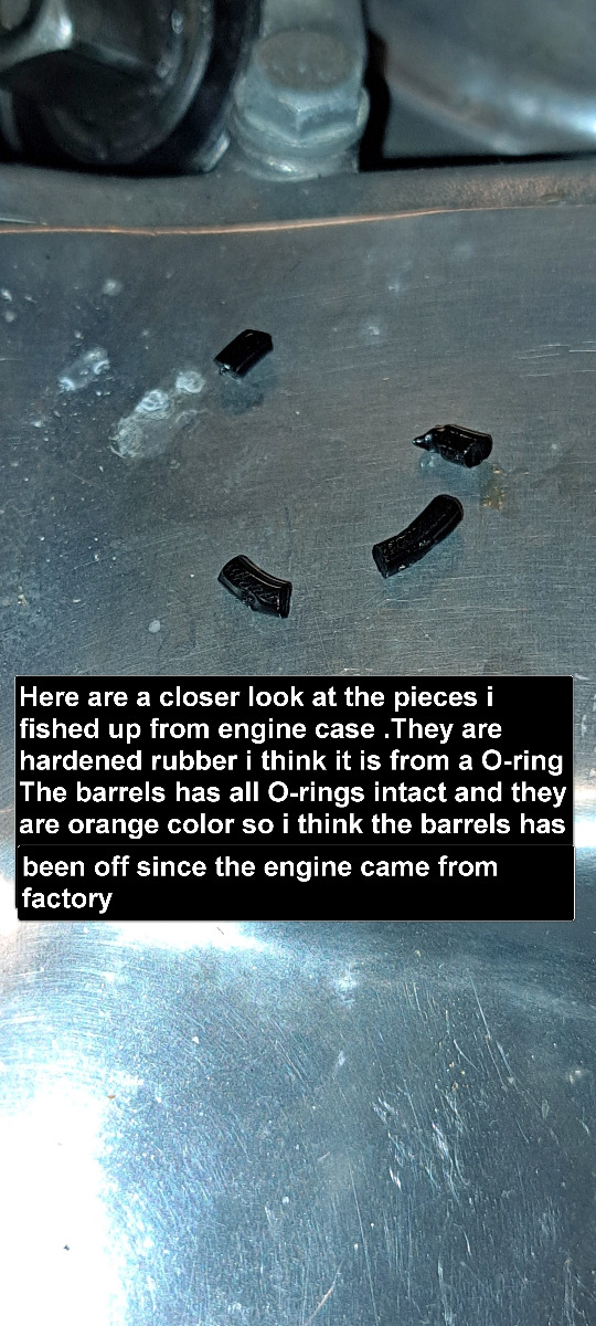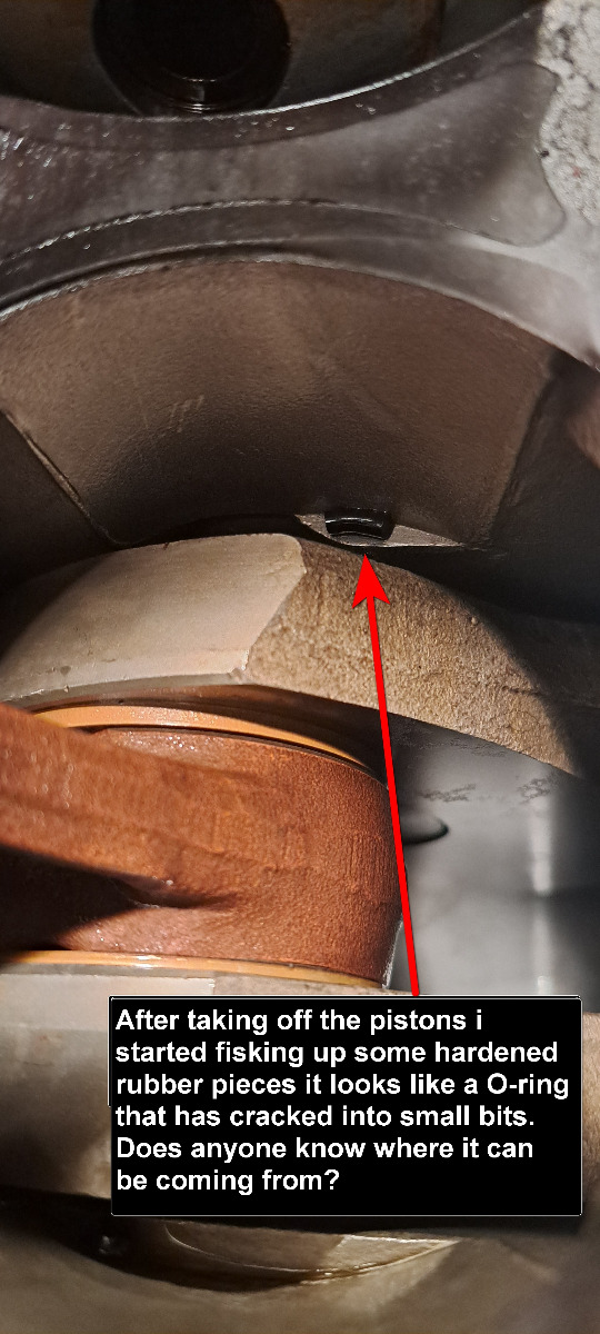 I would like to test the crank for runout and also the bearingclearances ,but then i have to split the cases and that is not possible this time. I measured the conrods sideplay and it was inside spec.I fished up some more black hardened rubber pieces i think it is from a O-ring but not sure .If someone know where it is coming from tell me !