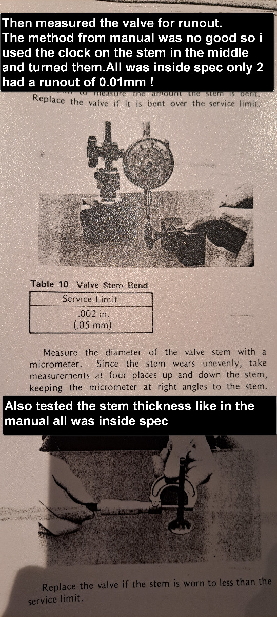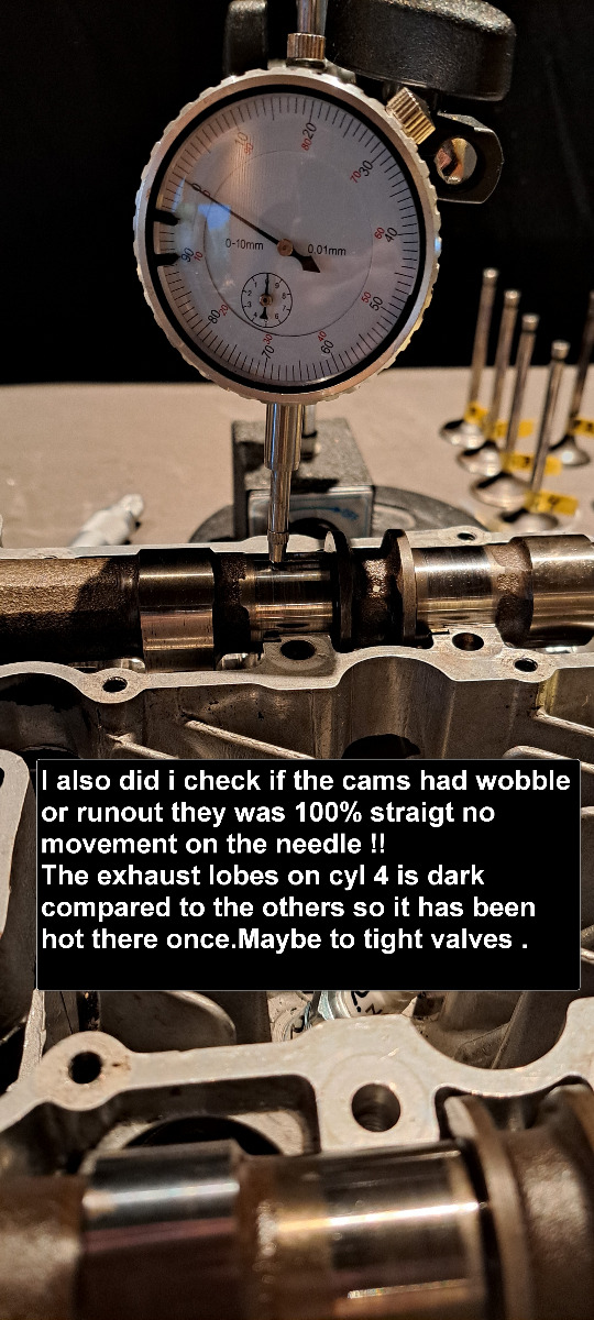 also done the wobbletest that i dont think is so acurate.The valves look very god and i dont think it is too long since someone refreshed them.The valveface width looks good i have not measured that yet,but no serius pitting .Maybe it is enough just to lap them .Today i have measured the camchafts for runout and also the