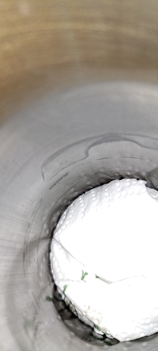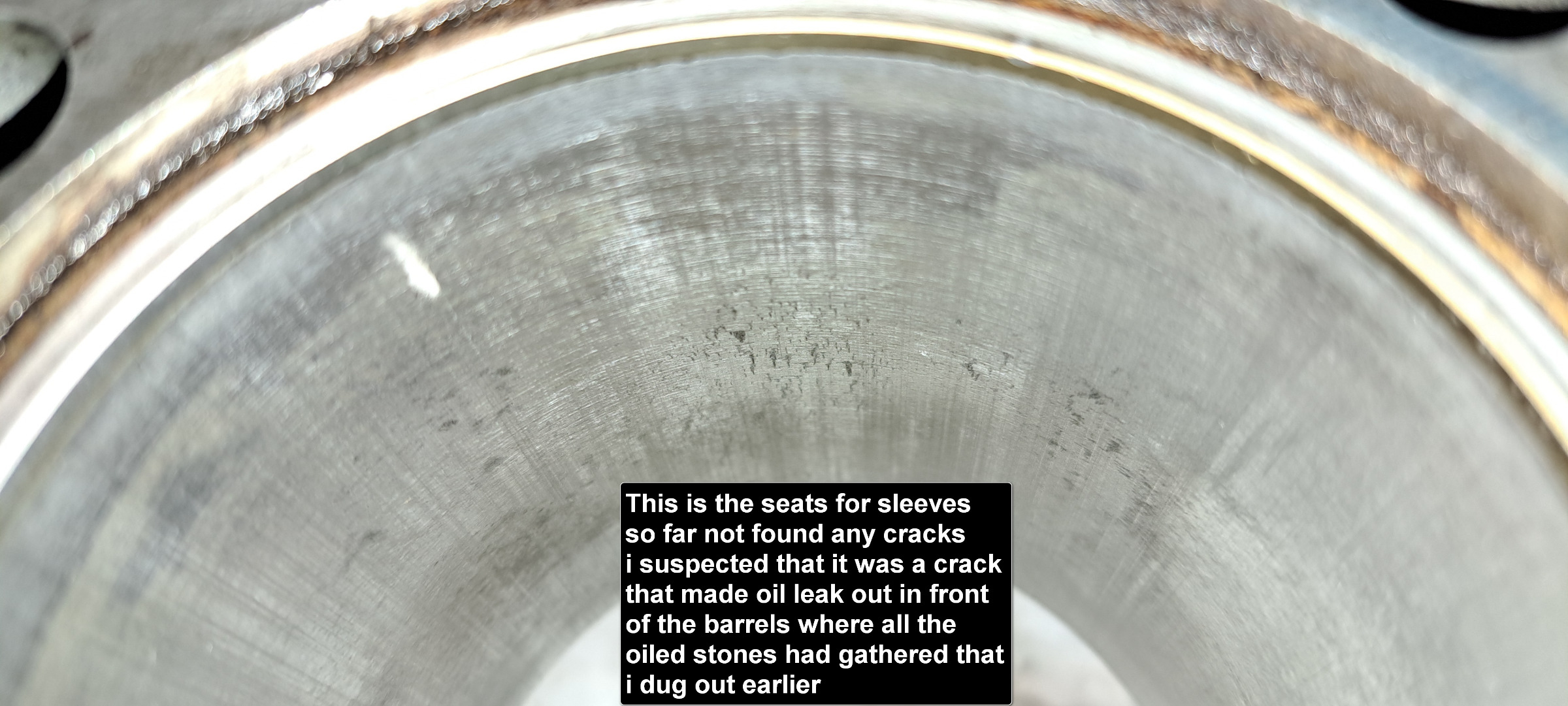 Not finished with the valves had to stop becuase i have a tennis elbow pain and that is not a good combination with valve lapping.So i started take a closer look in the cylinder bores.I found stripes in cyl 2 and 3.Im not sure if it is scratches or craks !. when using fingernail i can feel it in one place.I have measured the bores several times with bore dial gauge and the piston to wall clearance is inside spec so hoping a little honing will fix it. If they are cracks i will have to replace the sleeves. Did a little test with penetrating oil and a pistonring to see if the oil seeped out .I may take 2 of the sleeves out and check how they look on outside.