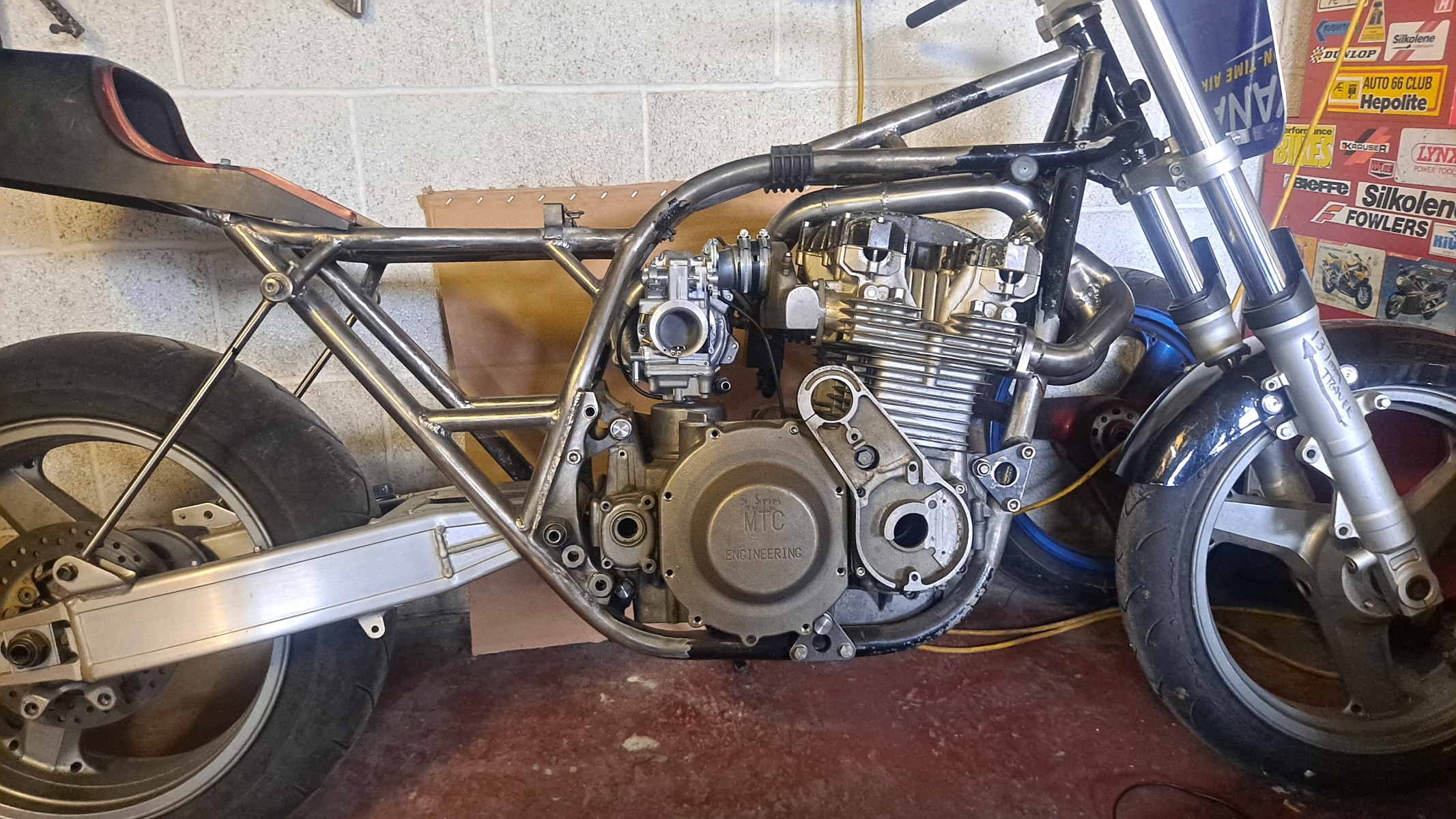 Rajay f40, Mikuni HSR42 carb, HD case and barrel studs, back cut trans, billet 2nd gear, welded MK2 crank, 10.25 wisecos, MLS head gasket ( no O,rings ) , Ported J head with larger stainless valves, APE guides, hd valve springs, HD camchain, Manual camchain tensioner, Solid idler sprockets, GPZ1100 Unitrack cams on slotted sprockets , lock up clutch with roller pusher and Bill Hahn boost retard ign.