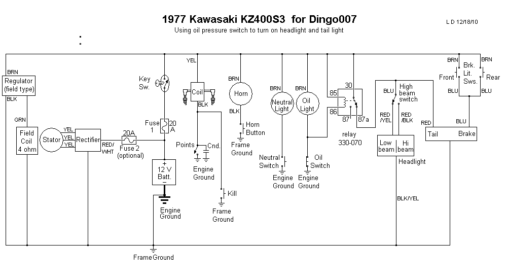 Here s a diagram for a KZ400 where he headlight and tailight are controlled by the oil pressure switch.