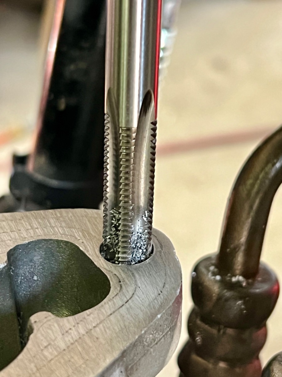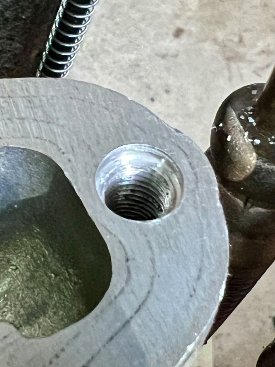 Well, everything was going way too well in getting my 750 engine buttoned up. During the final head re-torque, I managed to strip the front (timing chain tunnel) head bolt.