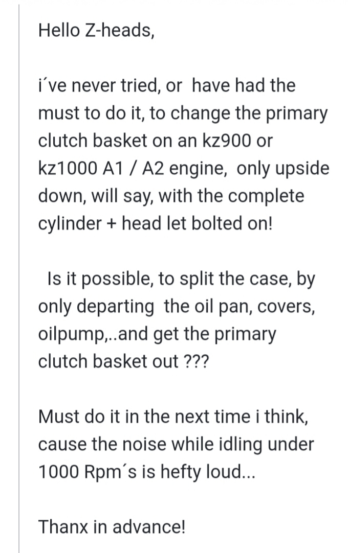 i´ve never tried, or have had the must to do it, to change the primary clutch basket on an kz900 or kz1000 A1 / A2 engine, only upside down, will say, with the complete cylinder + head let bolted on!