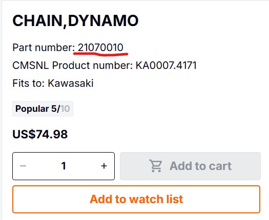 The part seems difficult to find in stock on just a quick search. Hoping someone knows the chain size and I can just make one out of bulk chain.