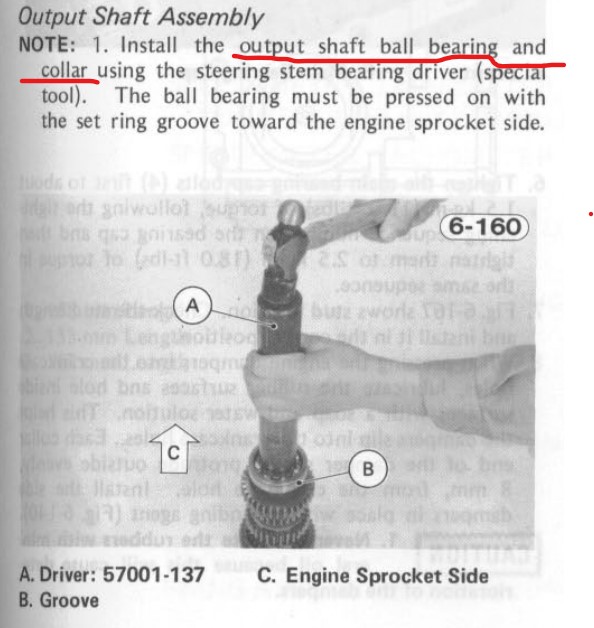 I removed the Transmission Cover housing today to replace the Clutch push rod, Gear change shaft and Output shaft oil seals and found that the collar is jammed tight on the output shaft (I can't even remove it off the shaft), I assumed the output shaft would spin inside the collar and not rotate with it (which means it's always spinning on the oil seal)