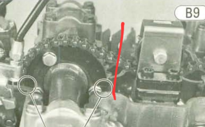 The witness marks on your cam cover webbings are positioned about where the red lines are on the picsbelow. The cam chain should be well clear of the cam cover at that point.
