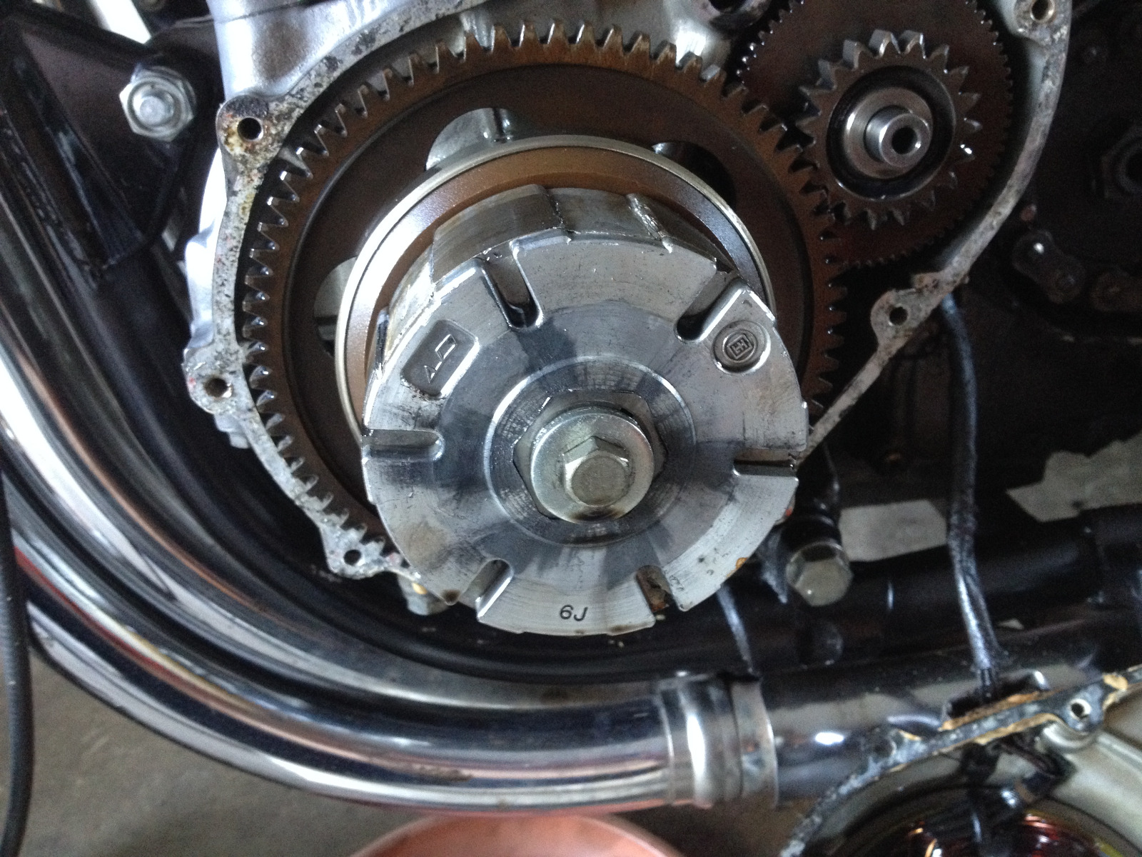 ...but the 3 8mm bolts to fix the rotor to the freewheel-cluth have been very tight, no loose,..but the little rod between the was broken..(.all in all a typical damage, in the last more than 4 decades, i´ve had this issue nearly often on all my Kawasakis, only my Z1B havn´t had this in 20 years of hard using..)