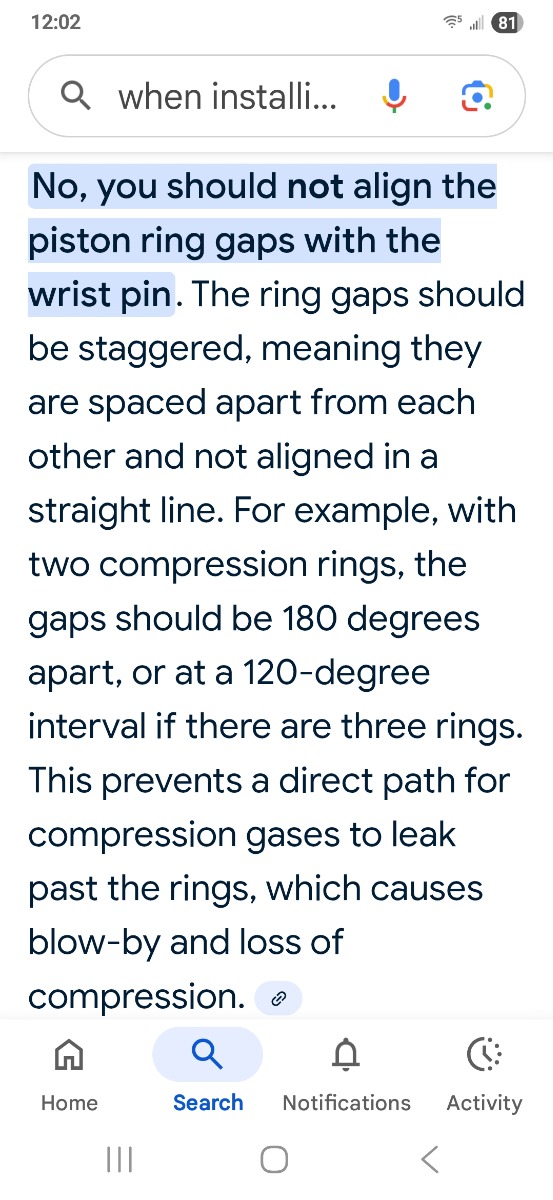 I am confused, that is pretty much what we have been saying with the exception of the wrist pin comment which contradicts MTC instructions !!! Where is it from ? I don’t see the correlation between ring gaps and wrist pin. I guess when you have contradictory guidance you need to go with your gut