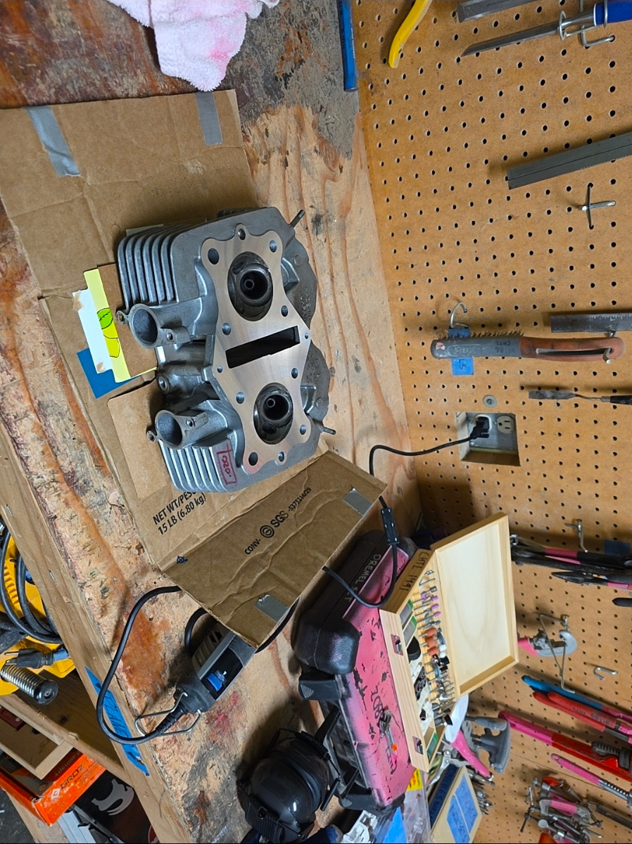 I stripped the head down and had it milled 0.5mm (.020") and then cleaned up the ports with a dremel. I mostly cleaned up the casting and removed a little material in some areas to improve flow but didn't get carried away. Left the intake ports a little rough from the 80 grit sanding drum for fuel atomization, the exhaust ports were worked up to a fine grit sandpaper. Replaced valve seals, valve seats freshened up, and added valve spring shims (Howards Cams 96210-60).
