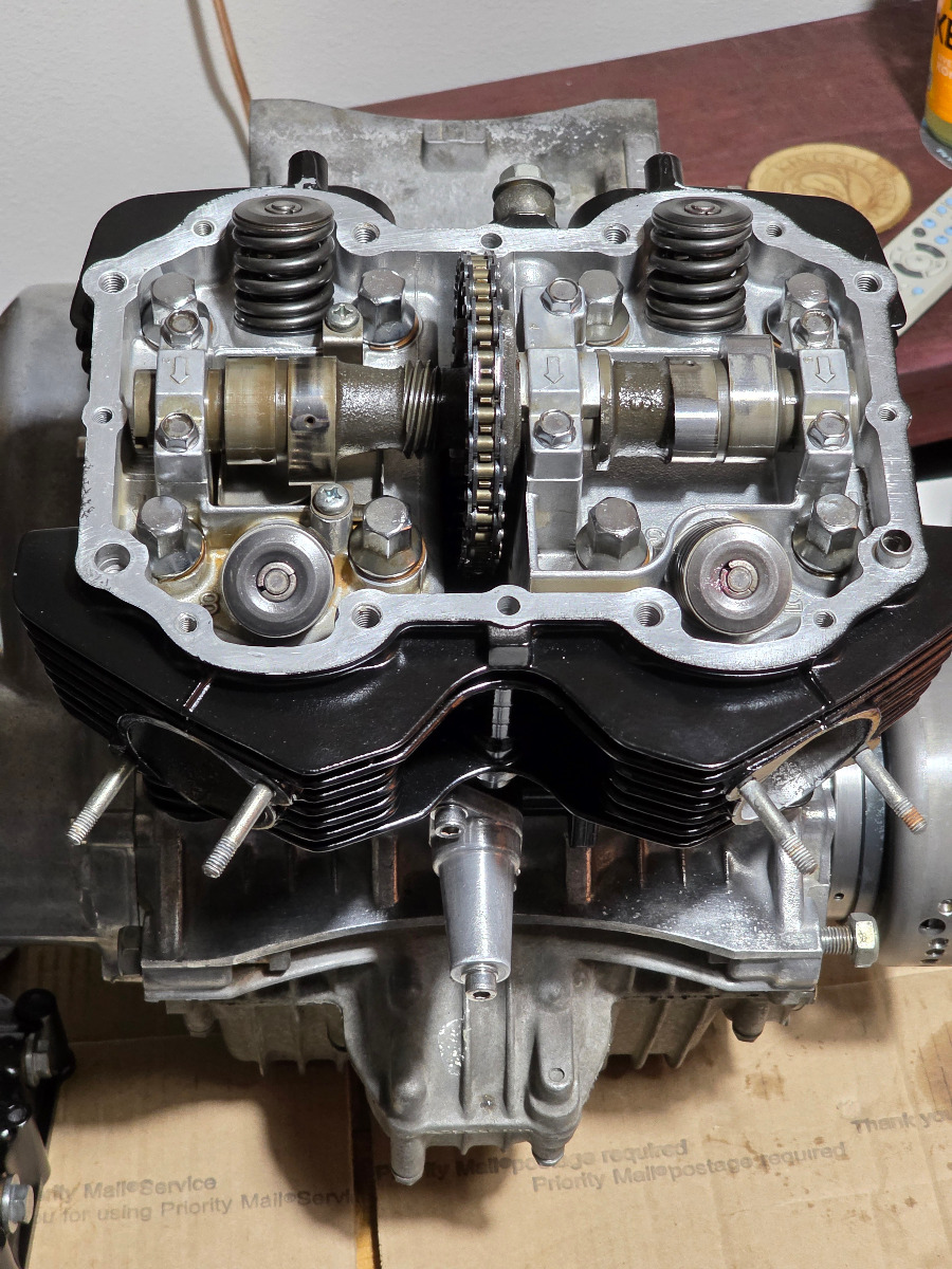 Final assembly of the cylinders and top end. Cleaned the parts and prepped for paint then put a few coats of satin black engine paint on.
