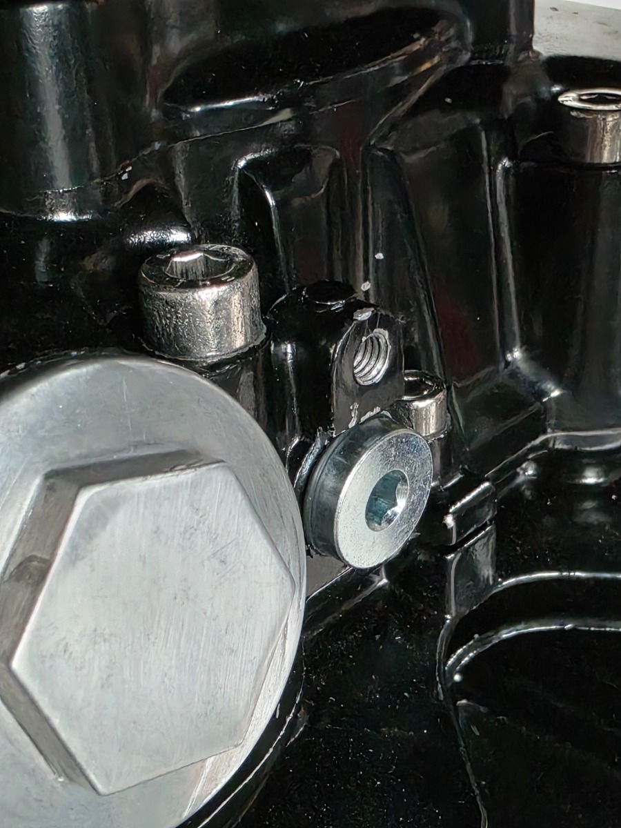 Plug for the the tachometer cable hole. Used a M14x1.5 tap and a magnetic oil drain plug with sealant on the threads and an o-ring.