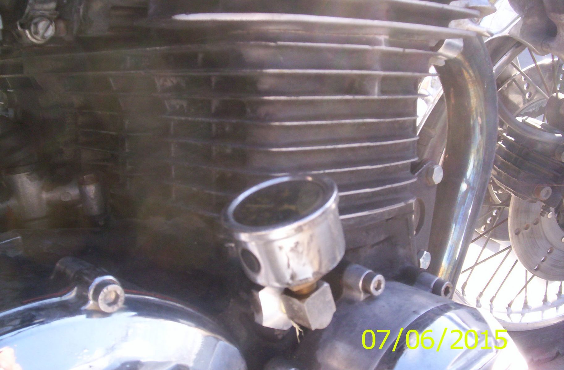 I reworked my oil pump. Instead of 3-10 PSI I have around 20 when cold. As much as 30 at Rev. It goes down as it heats up. Multi grade oil. I blew two Doremi gauges. I returned one and kept the other for the sexy plumbing fixture. This is a cheap Sportster gauge. 60 PSI. It works fine but the Bezel is plastic and is discoloring in the sun. I plan to repaint the case and get a better one soon.