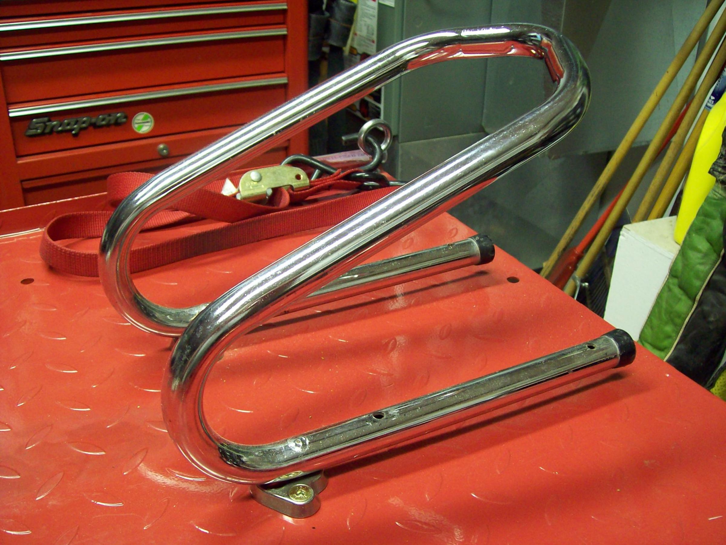 MadShad wrote: Bolted on my wheel chock tonight, makes things much easier. I can now push the bike onto the lift and have it captured by the chock and held upright, making the process of strapping it down by myself easy.