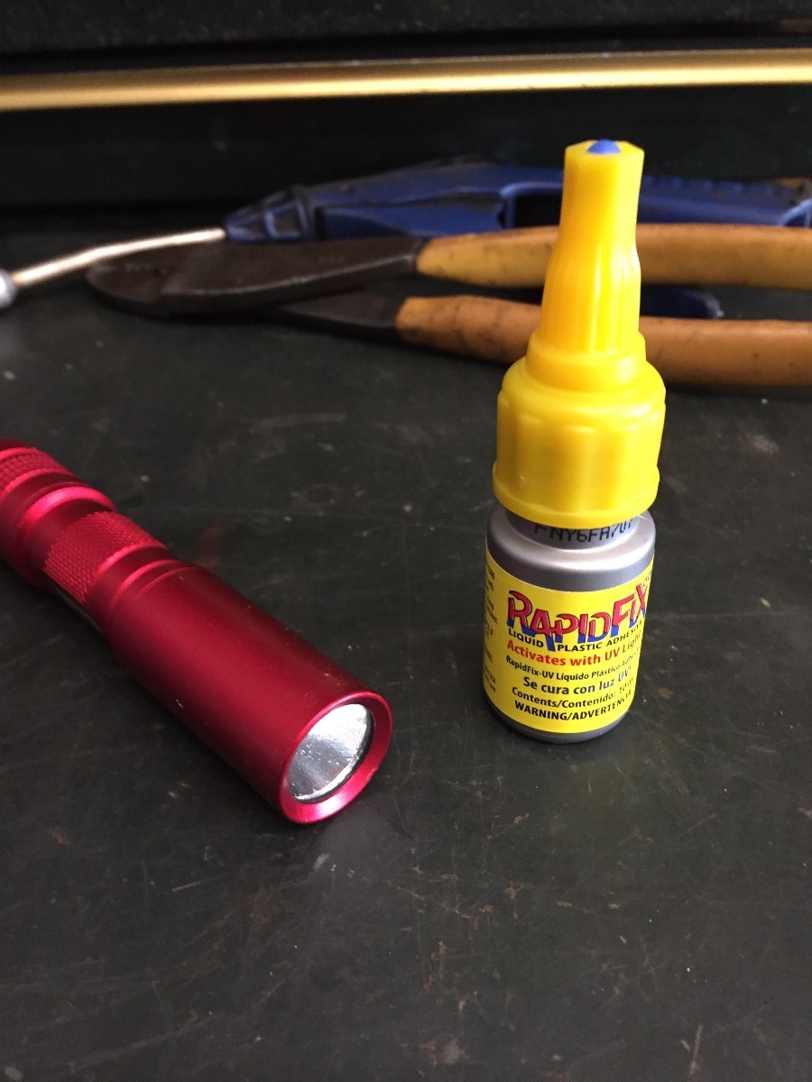 Purchased this from the local Napa parts store. It link of like super glue but UV light activated. Works good on plastic.