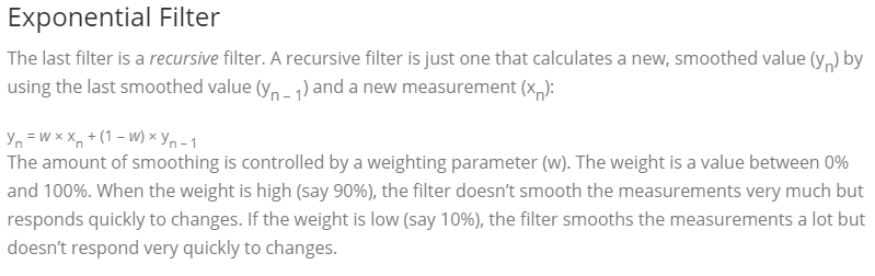 I had to sync my new carbs so i implemented the exponential filtering which seemed to help a bit. I didn't spend too much time tinkering with finding the right averaging and weight values. Here's the code: