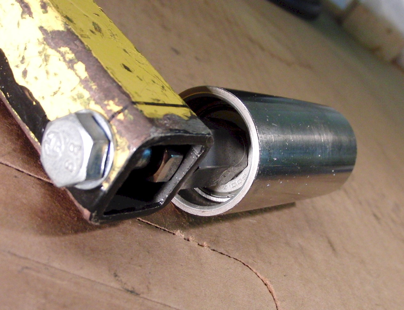 I found some ball-bearing rollers to use as the rotating handle, then just slid on a piece of PVC as a slip grip for the shaft. The socet is held to a 3/8" u-joint which is welded to the shaft.