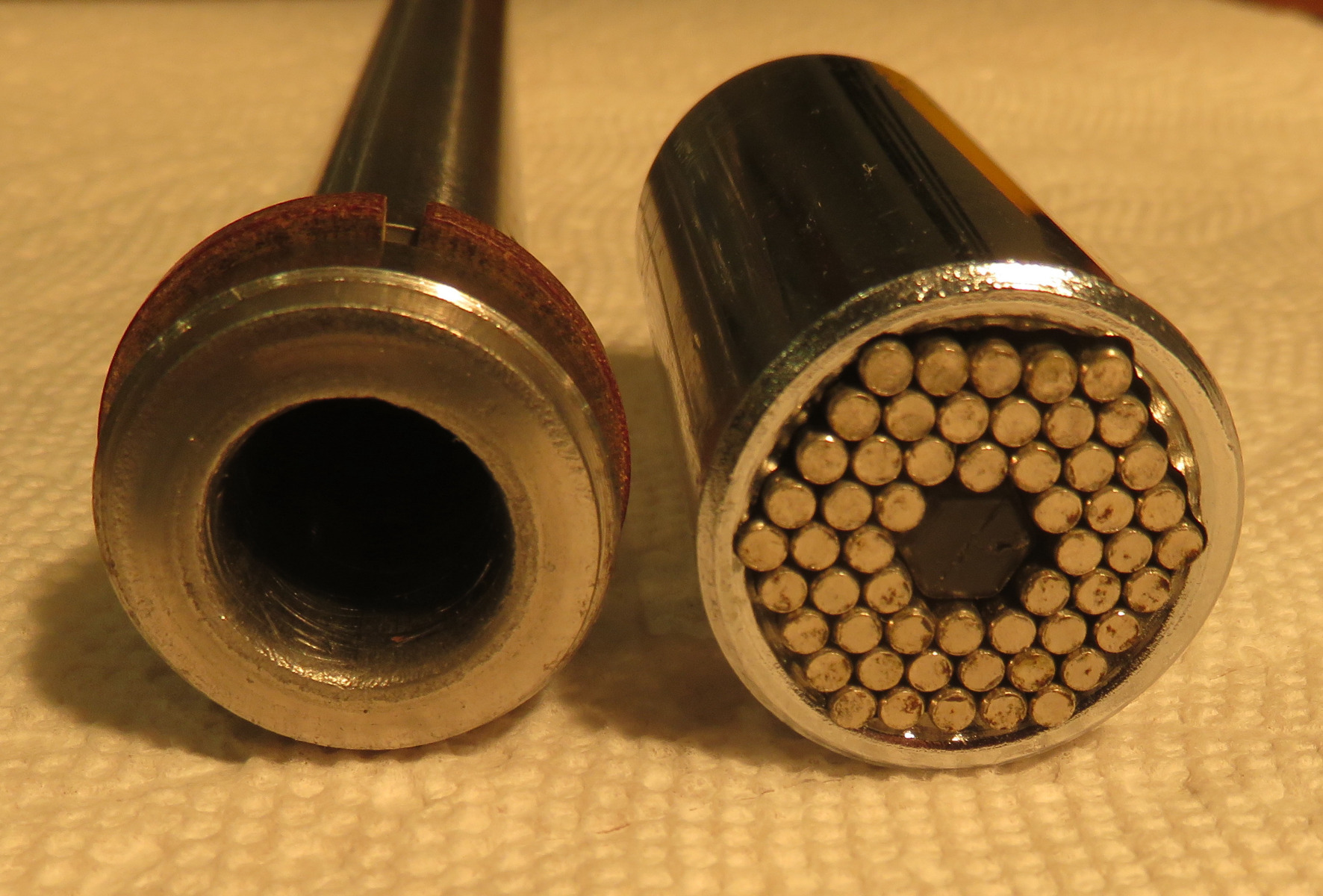 If your fork cylinders are similar to mine the Gator Grip tool as shown in the photo in posting #816278 above won’t work. This is because the outer circumference of the Gator Grip tool hits the outer circumference of the fork cylinder, and this prevents the pins in the Gator Grip tool from engaging the fork cylinder. So the fork cylinder will not sink into the Gator Grip tool. The images below should help show this issue. Ed