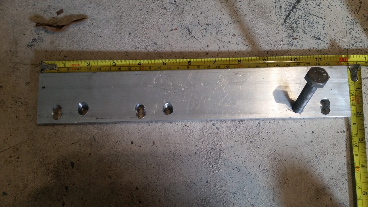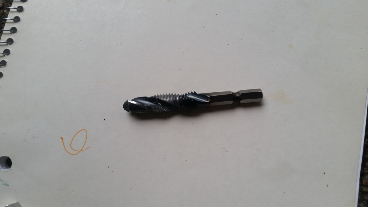 ......so I had to drill/tap the holes by hand. I assumed the Honda/Accura tool was drilled at 45 degrees (incorrectly...more on that later), so I placed this tool and my plate side by side, and eye balled the leaning bolt to mimic the angle. Punched a dent on my mark, then started drilling with 5/32 bit at 45 degrees (...in my brain). Then switched to a bigger 3/8 drill bit (the Honda/Accura bolt is M10 x 58 mm x 1), and drilled a bigger angled hole before tapping. I had a hell of a time trying tapping at an angle with a regular tap. What saved the day was a drill/tap combination on same bit. The drill part acts as guide, the tap does the rest. It was very easy this way,....all by hand of course.