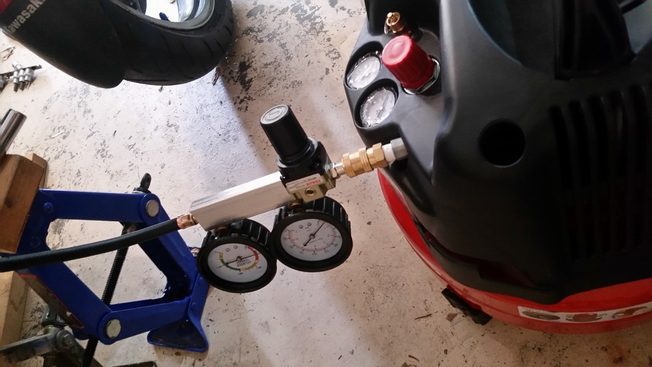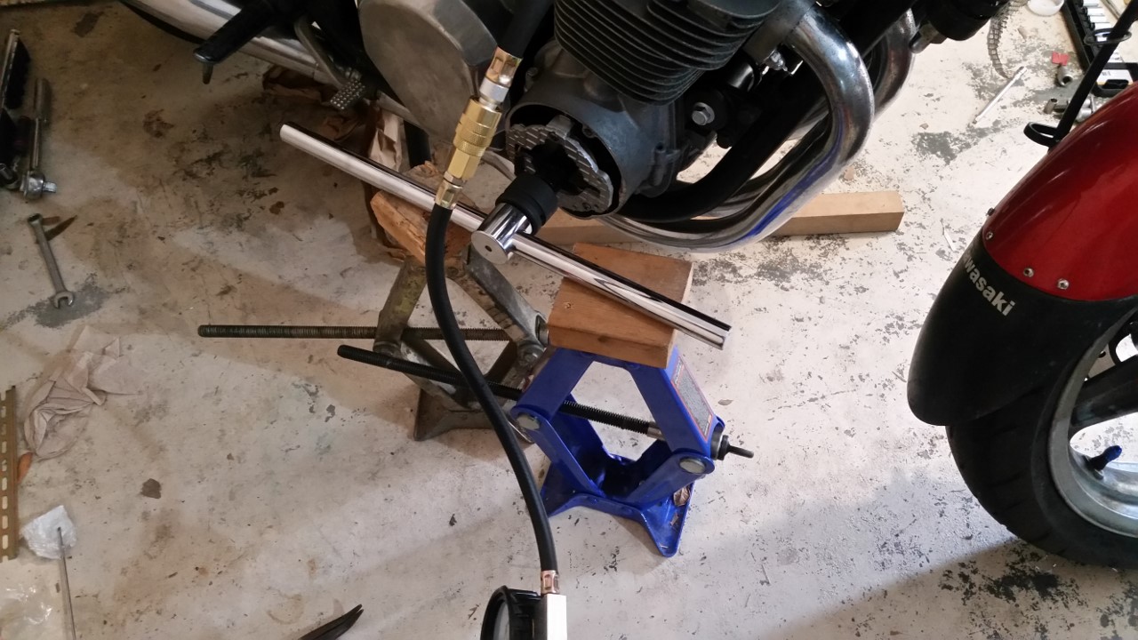Also, did not know for sure if 40 psi (1.05 Kg/cm2) would not try to turn the crankshaft on either direction, thus applied this gizmo to the crankshaft nut, just in case. Probably quite unnecessary, but again, I was being paranoid (putting bike in gear an blocking rear tire would be smarter and simpler).