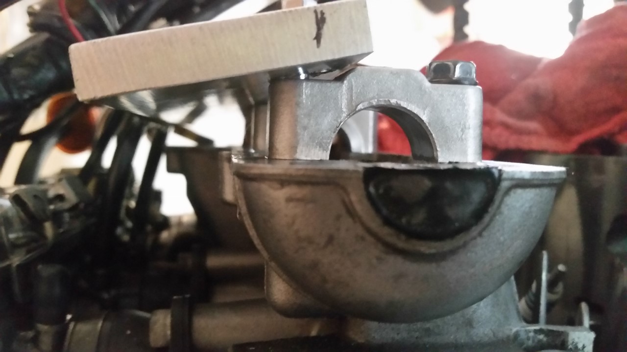 Now bad news..........I thought the Honda/Accura tool angled bolt holes I was copying were at 45 degrees ...wrong....they were at 30 degrees! (16-valve heads tend to be pentroof, not hemisferical). I could set my plate flat on the edge of the top bearing caps, clearing the 'hump', but the holes angle was too vertical, needed more. Thus decided to move the plate forward on the caps, and get it to rest on the cap's 'hump' (where number and arrow are), that achieved the more appropriate angle. Drilled new mounting holes a bit south, and for locating the plate on the top bearing caps I used the longer M6 x 41 mm bolts from the Zephyr valve cover. I did not tightened them much, just snuggled them.